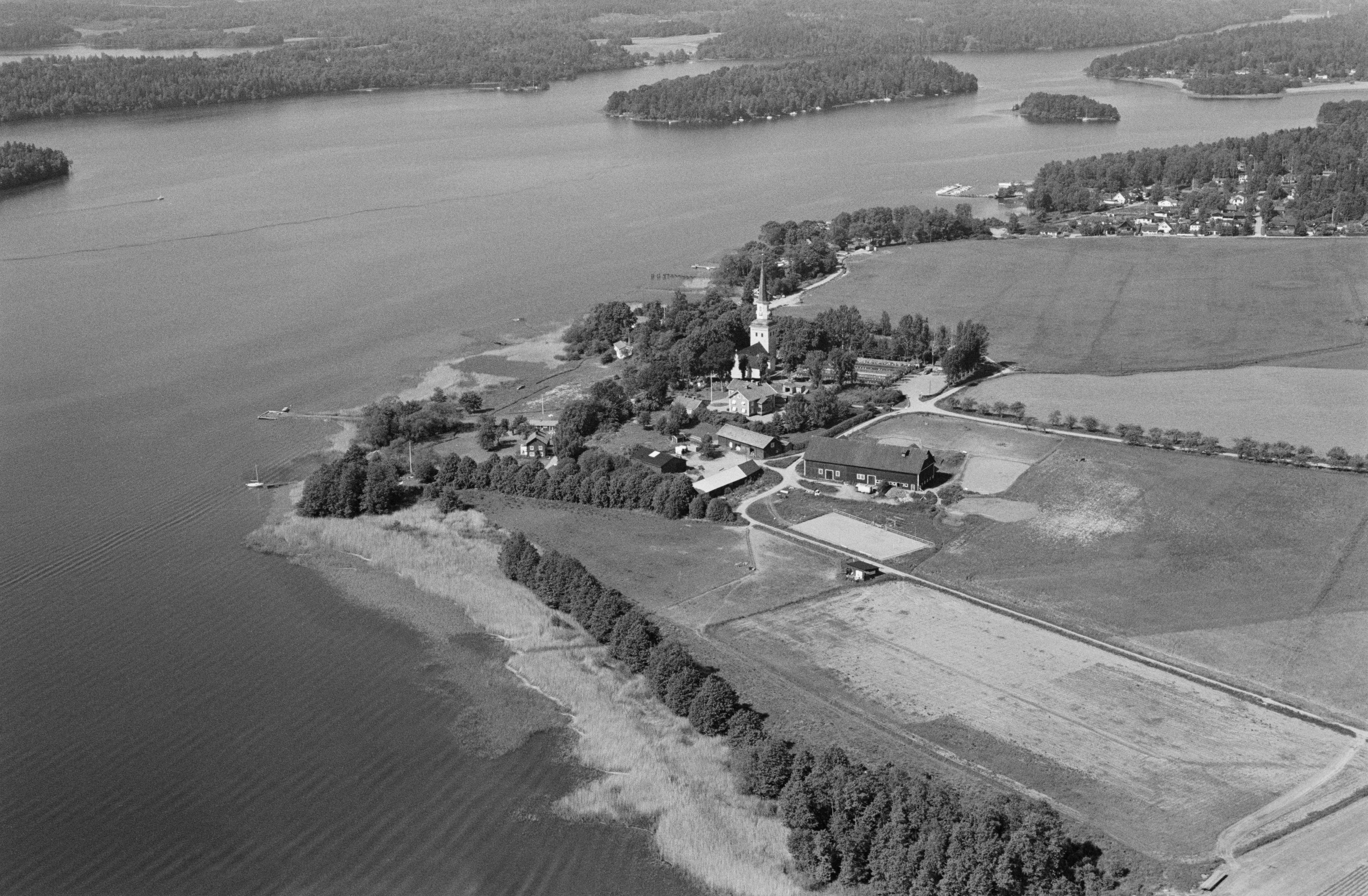 Beskrivning: Kyrkfjärden i Mälaren. Ekerö kyrka och Asknäs herrgård. Vid kyrkan flera fornlämningar, bl.a. hög RAÄnr Ekerö 2:1. Helgö uppe till höger. Bilden är tagen mot (väderstreck): VSV