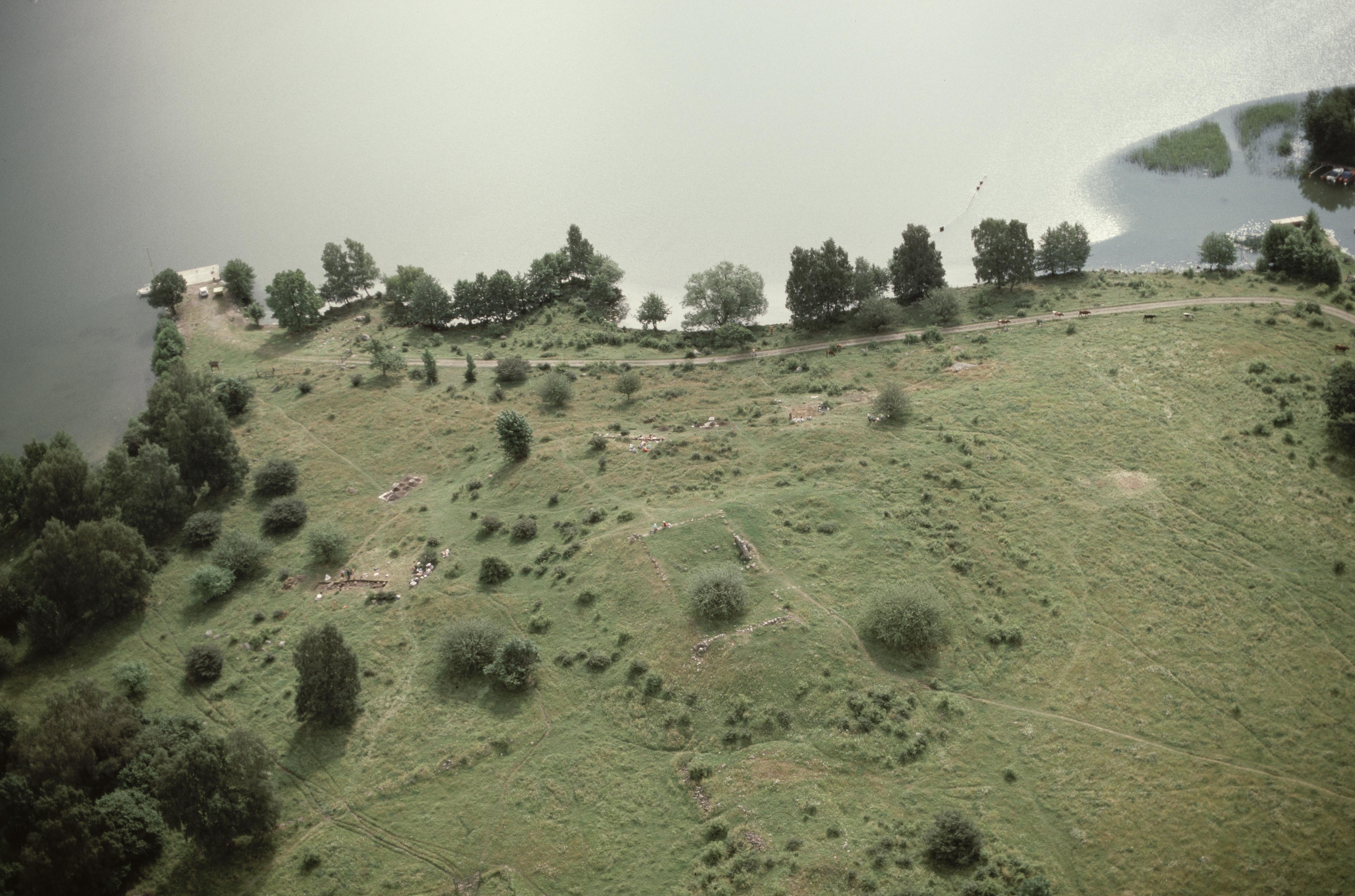 Beskrivning: Fornlämningsområdet Hovgården RAÄnr Adelsö 46:2 på Adelsön vid Hovgårdsfjärden i Mälaren. Arkeologisk undersökning i Alsnö hus RAÄnr Adelsö 47:1, stensättningar Adelsö 236 och 237 m.fl. Bilden är tagen mot (väderstreck): OSO