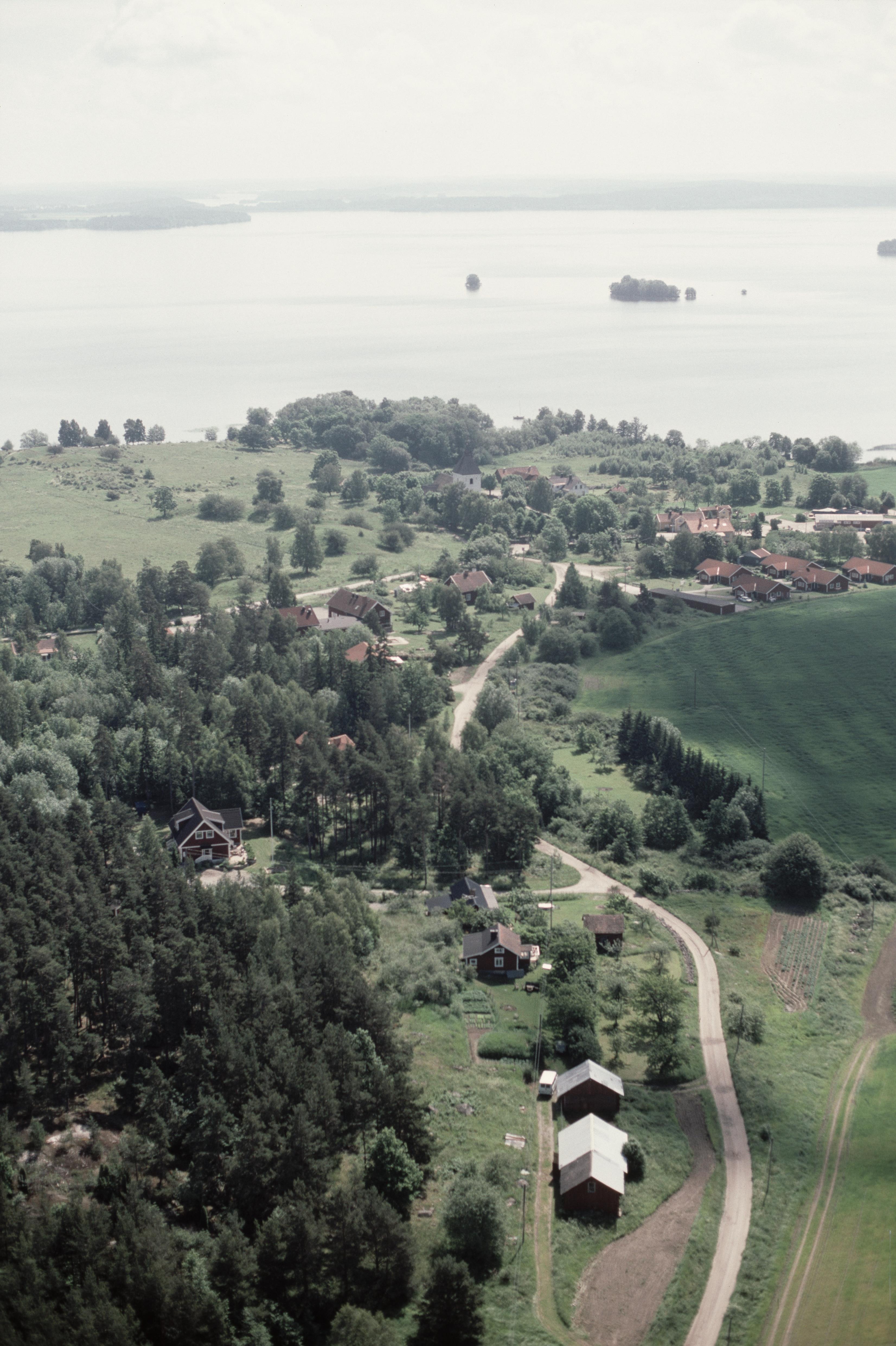 Beskrivning: Hovgårdsberg. I bildens övre del fornlämningsområdet Hovgården RAÄnr Adelsö 46:2 på Adelsön vid Hovgårdsfjärden i Mälaren. Alsnö hus RAÄnr Adelsö 47:1, Adelsö kyrka, Kungshögarna Adelsö 48:1-6 m.fl. Bilden är tagen mot (väderstreck): OSO
