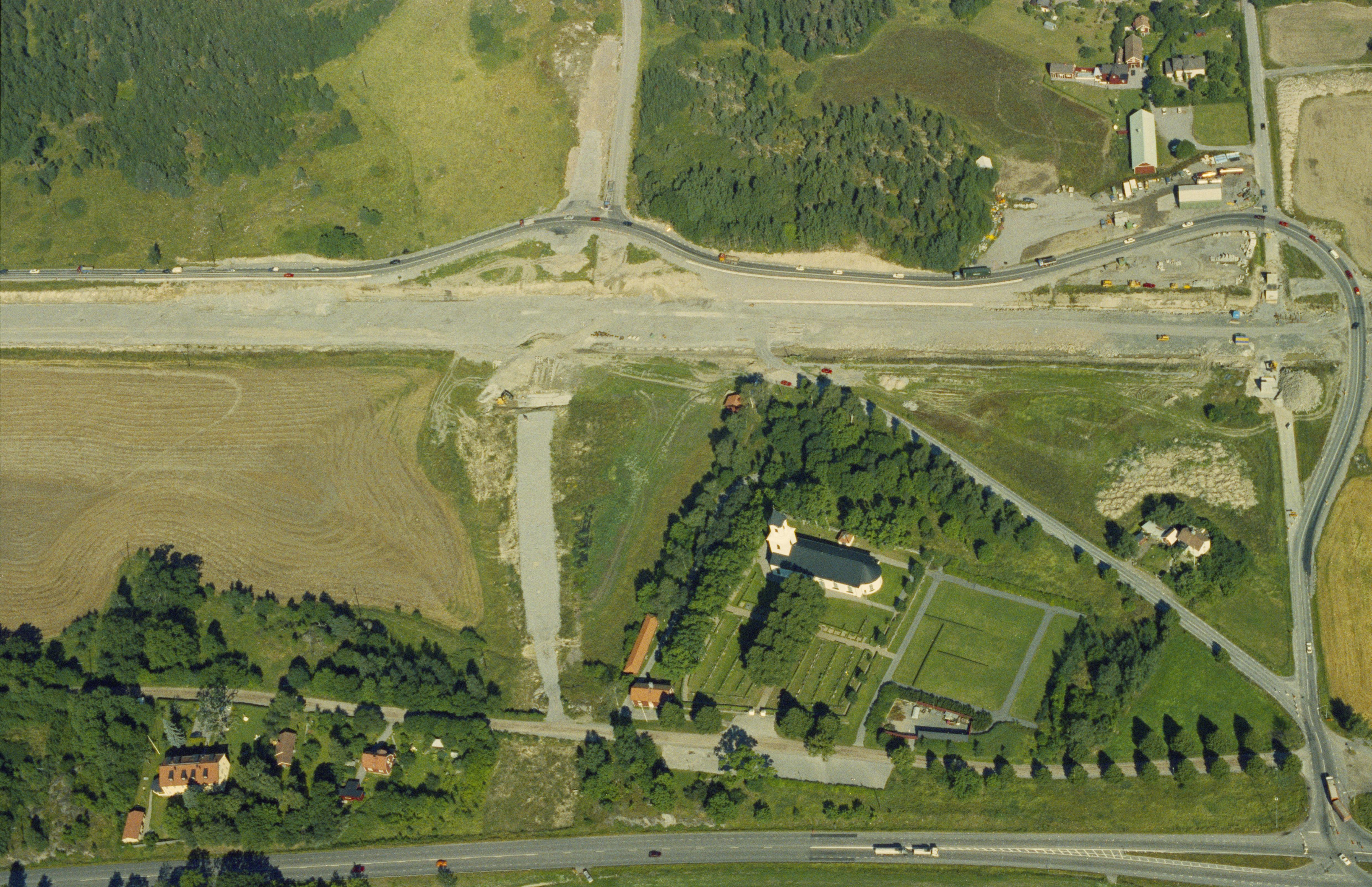 Beskrivning: Bygge av väg E4 vid Borgs kyrka och Herrebro (i tid. Borgs socken). Bilden är tagen mot (väderstreck): NNV