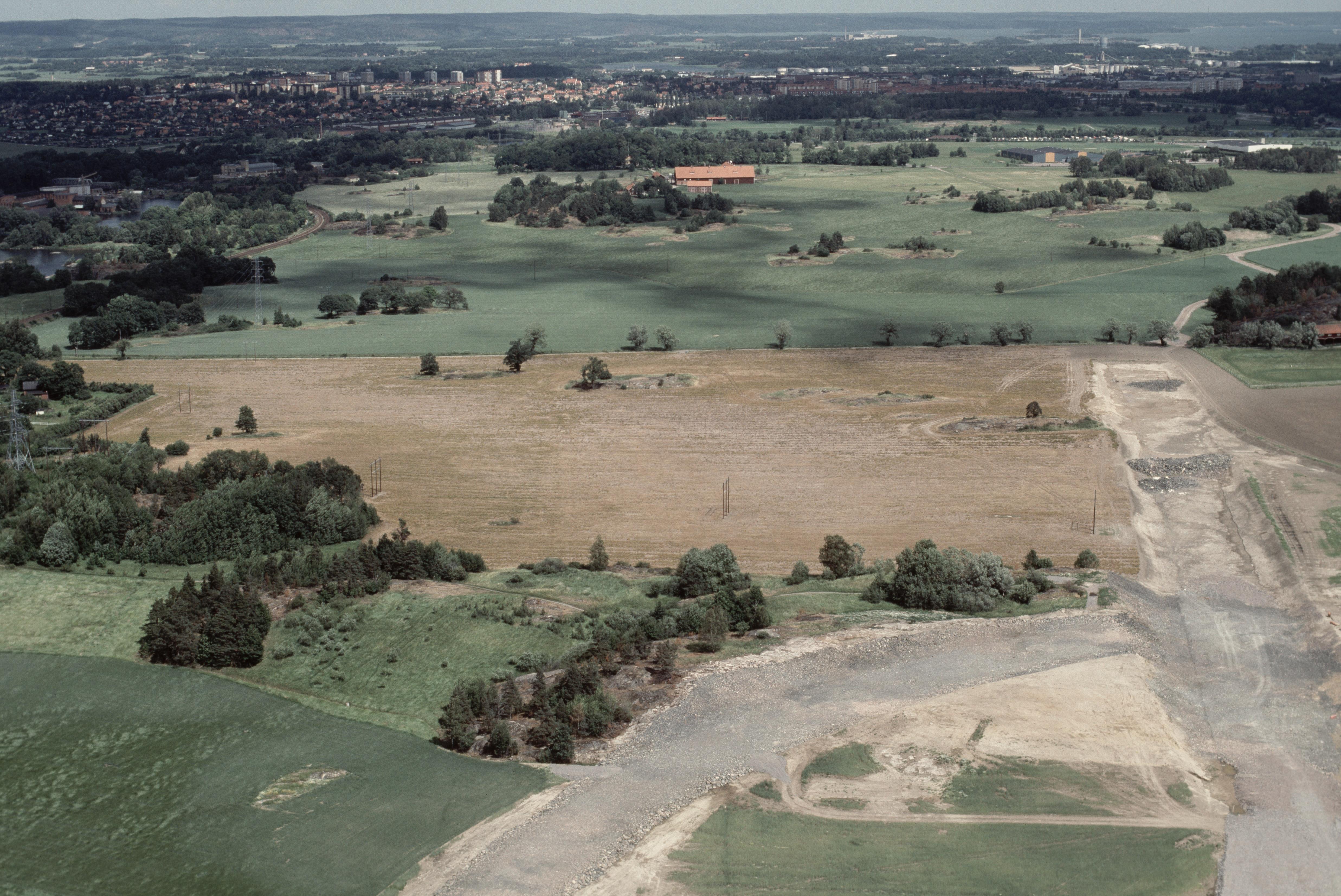 Beskrivning: (Tid. Borgs socken). Bygge av väg E4 genom hällristningsområde RAÄnr Borg 23:1, 24:1, 25:1, 26:1-2, 27:1 m.fl. Borgs säteri och Skälvs gård. I bildens övre del Norrköpings stad. Bilden är tagen mot (väderstreck): NO