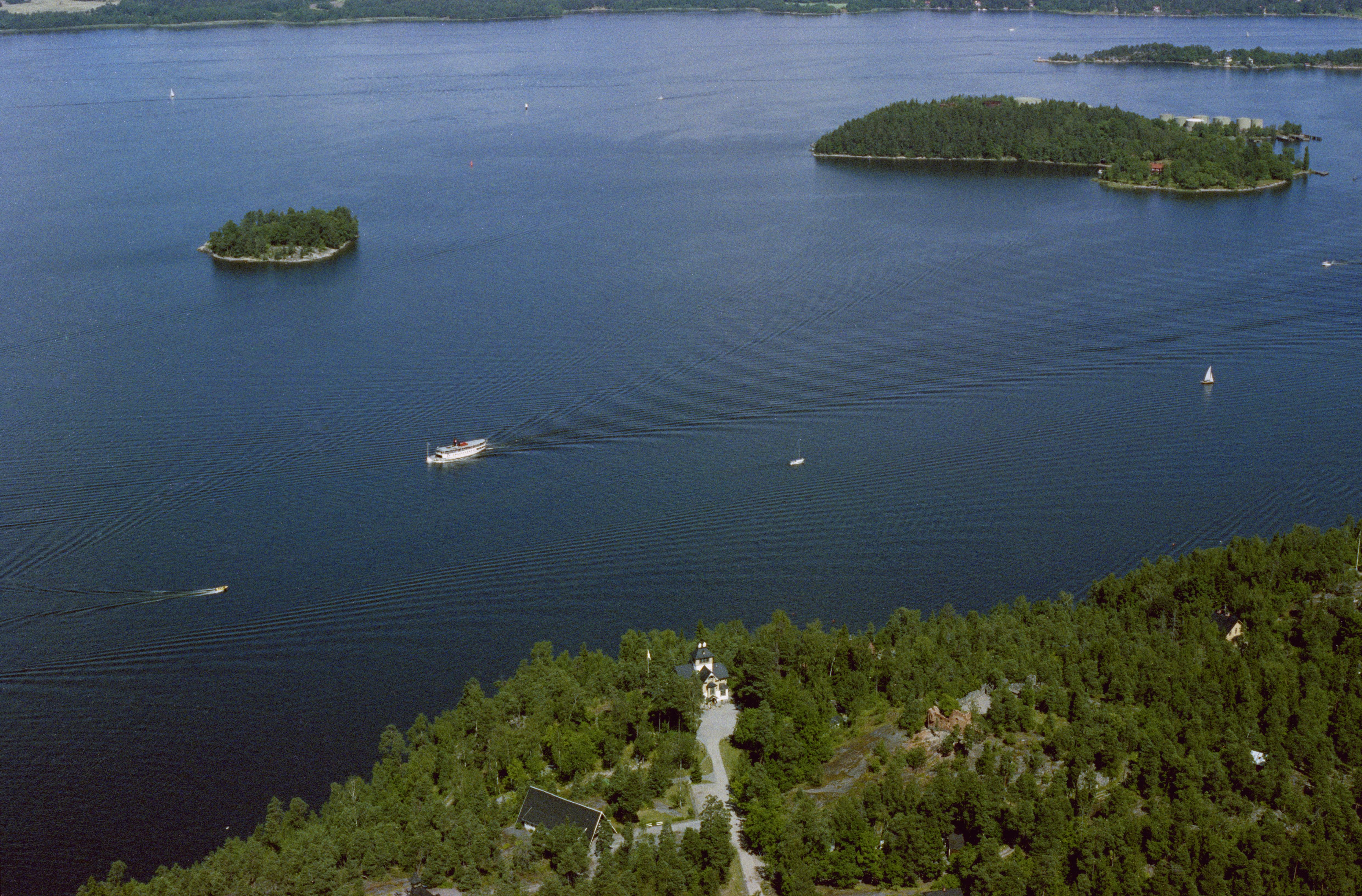 Beskrivning: Båttrafik i Höggarnsfjärden vid öarna Lilla och Stora Höggarn. I bildens nedre del Grävlingsbergs sommarvillor i Kummelnäs. Vid villorna finns en konstgjord "slottsruin". Lidingö socken i bildens övre del. Bilden är tagen mot (väderstreck): NV