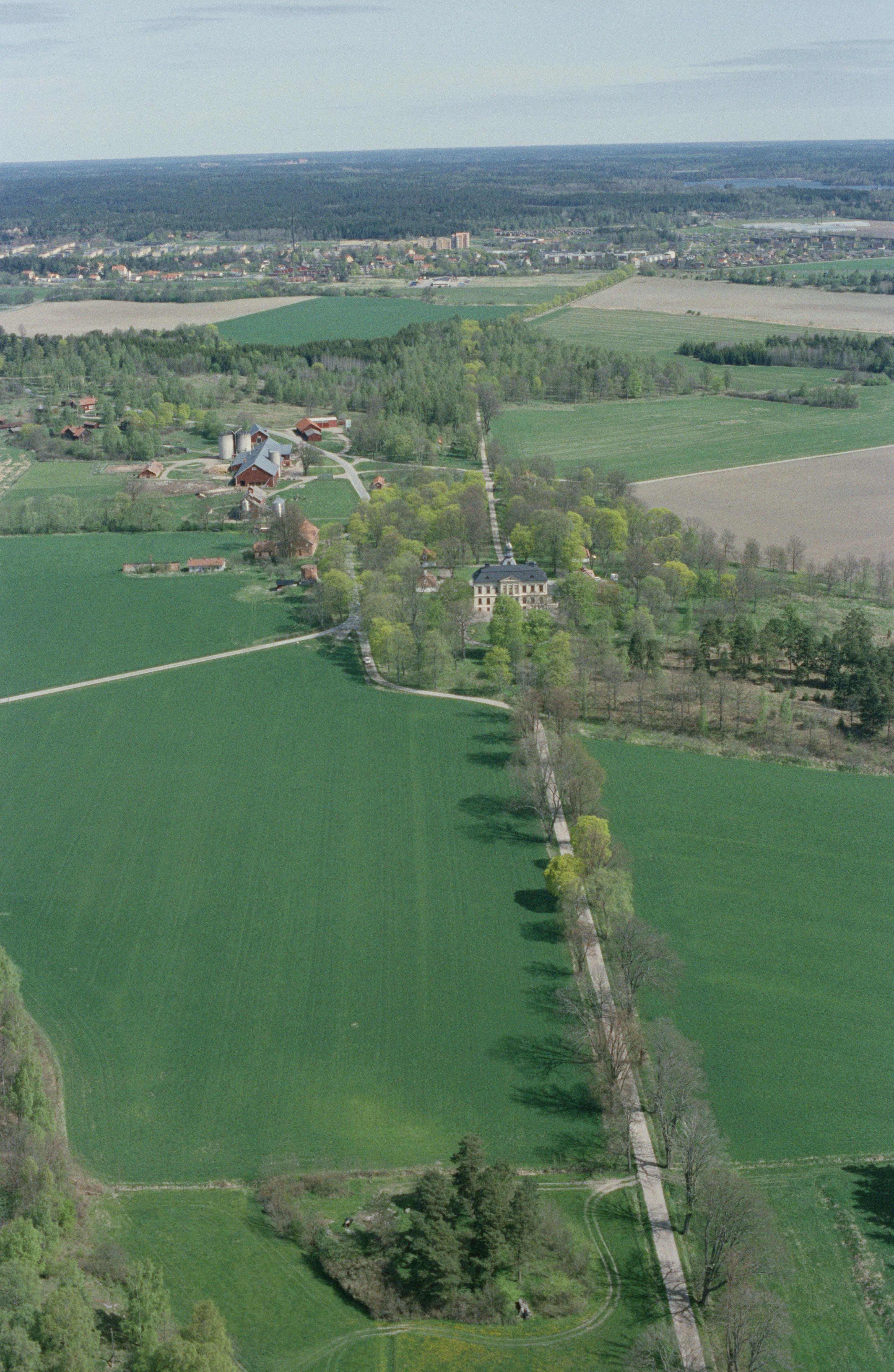 Beskrivning: Brogårds herrgård (skrivs även Bro Hof slott). Herrgården har underjordiska gångar till flygelbyggnaderna RAÄnr Bro 91:1. I bildens övre del Bro kyrka, Husby bo- och gravplats RAÄnr Bro 297 och Bro 83:1, Bro tätort m.m. Bilden är tagen mot (väderstreck): NNO