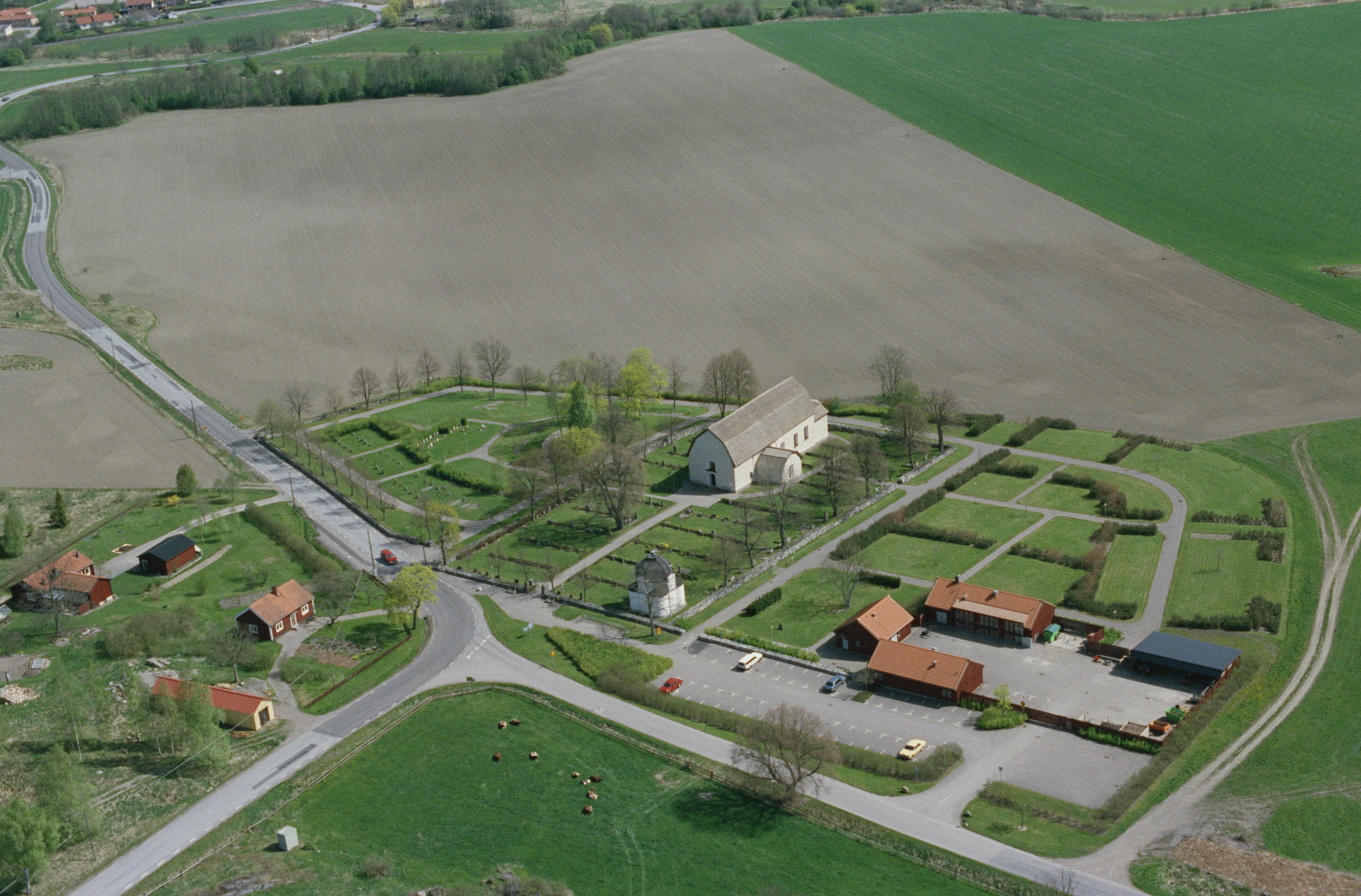 Beskrivning: Bro kyrka vid fornlämningsområdet Husby i Bro. I bildens nedre del Husby boplats och gravfält RAÄnr Bro 297 och Bro 83:1. Bilden är tagen mot (väderstreck): NO