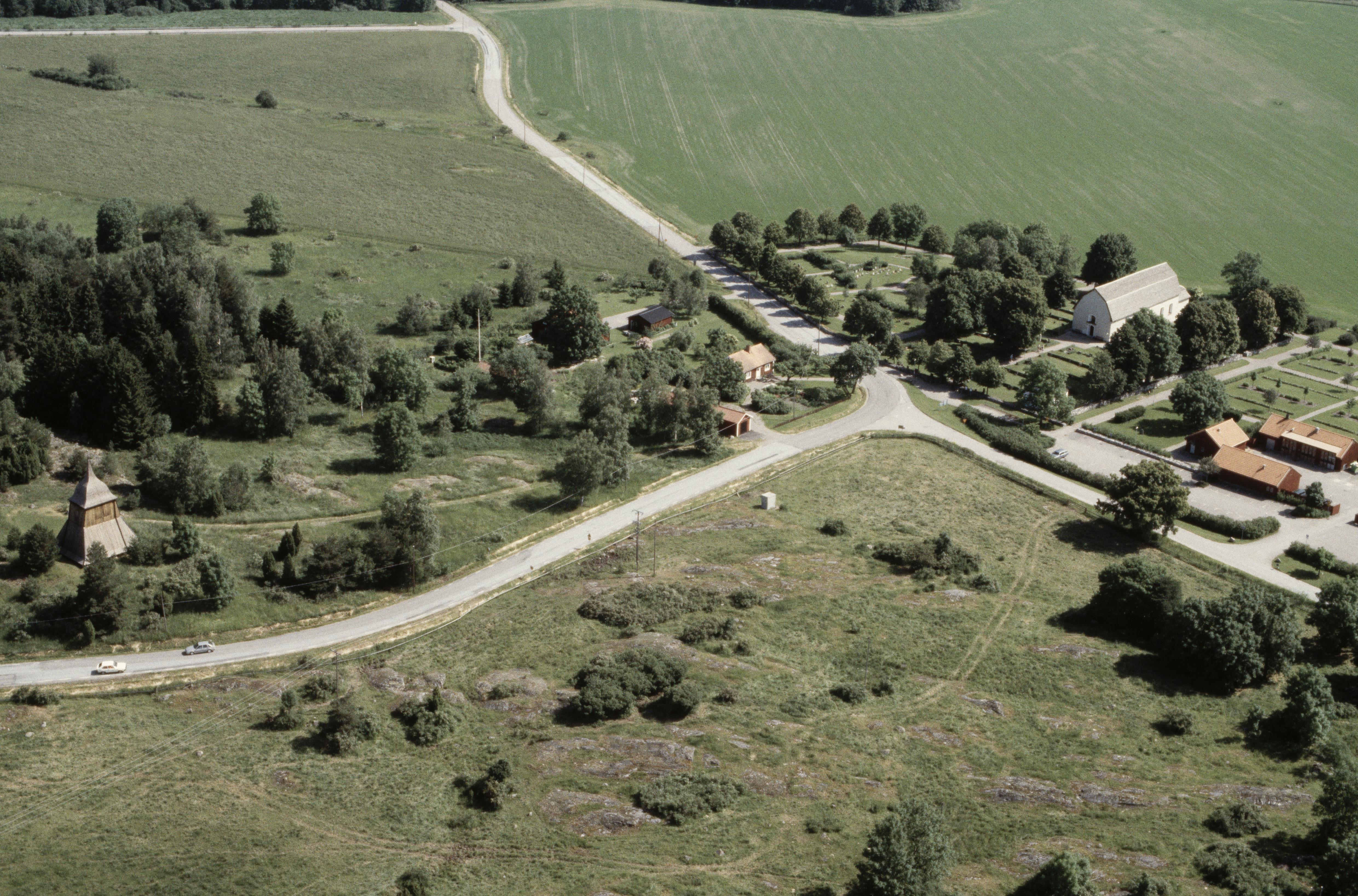 Beskrivning: Bro kyrka vid fornlämningsområdet Husby i Bro. I bildens nedre del Husby boplats och gravfält RAÄnr Bro 297 och Bro 83:1. Bilden är tagen mot (väderstreck): NO