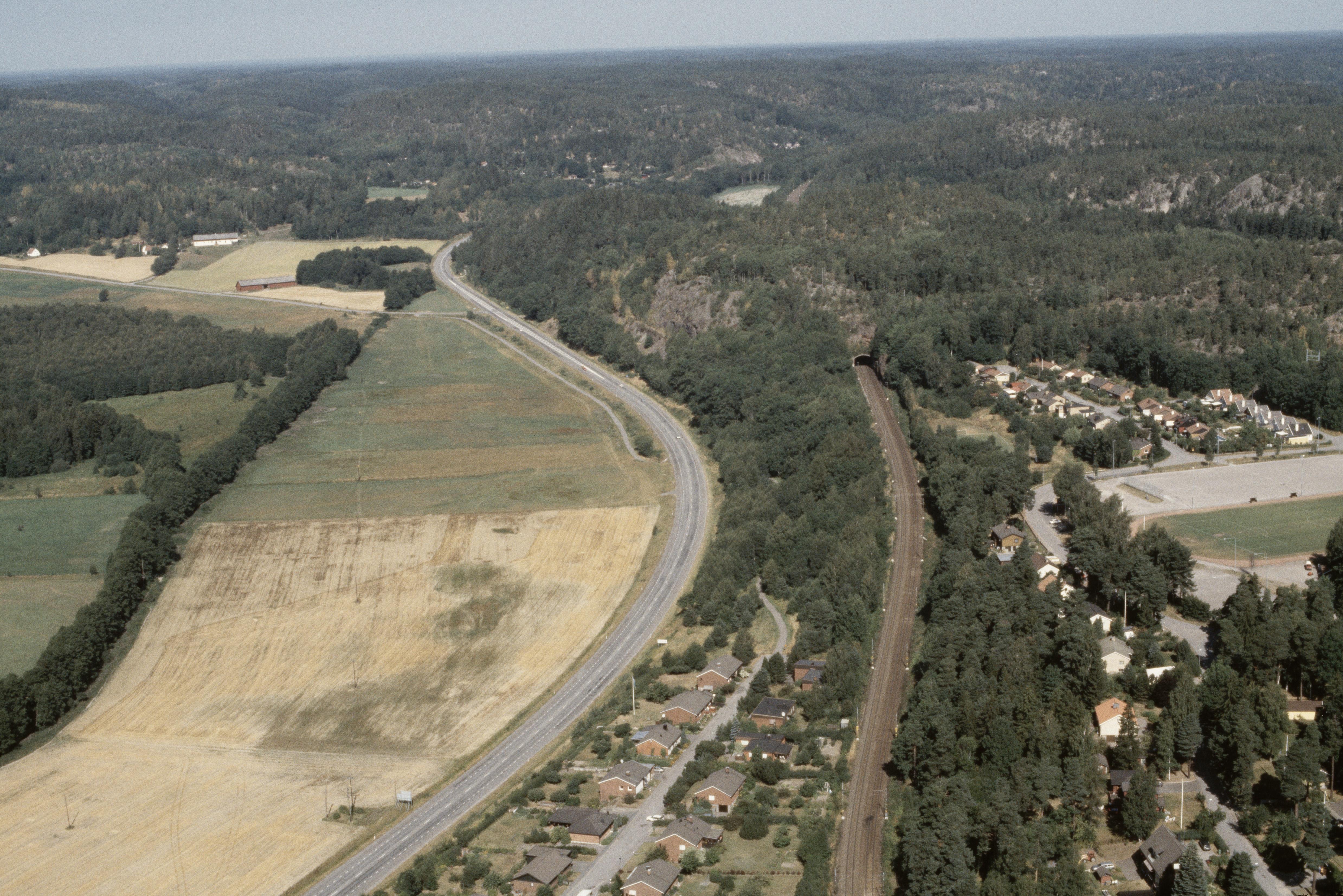 Beskrivning: Åby tätort. Fyndplats RAÄnr Kvillinge 100:1, 112:1 m.fl. vid bildens mitt. Bilden är tagen mot (väderstreck): N
