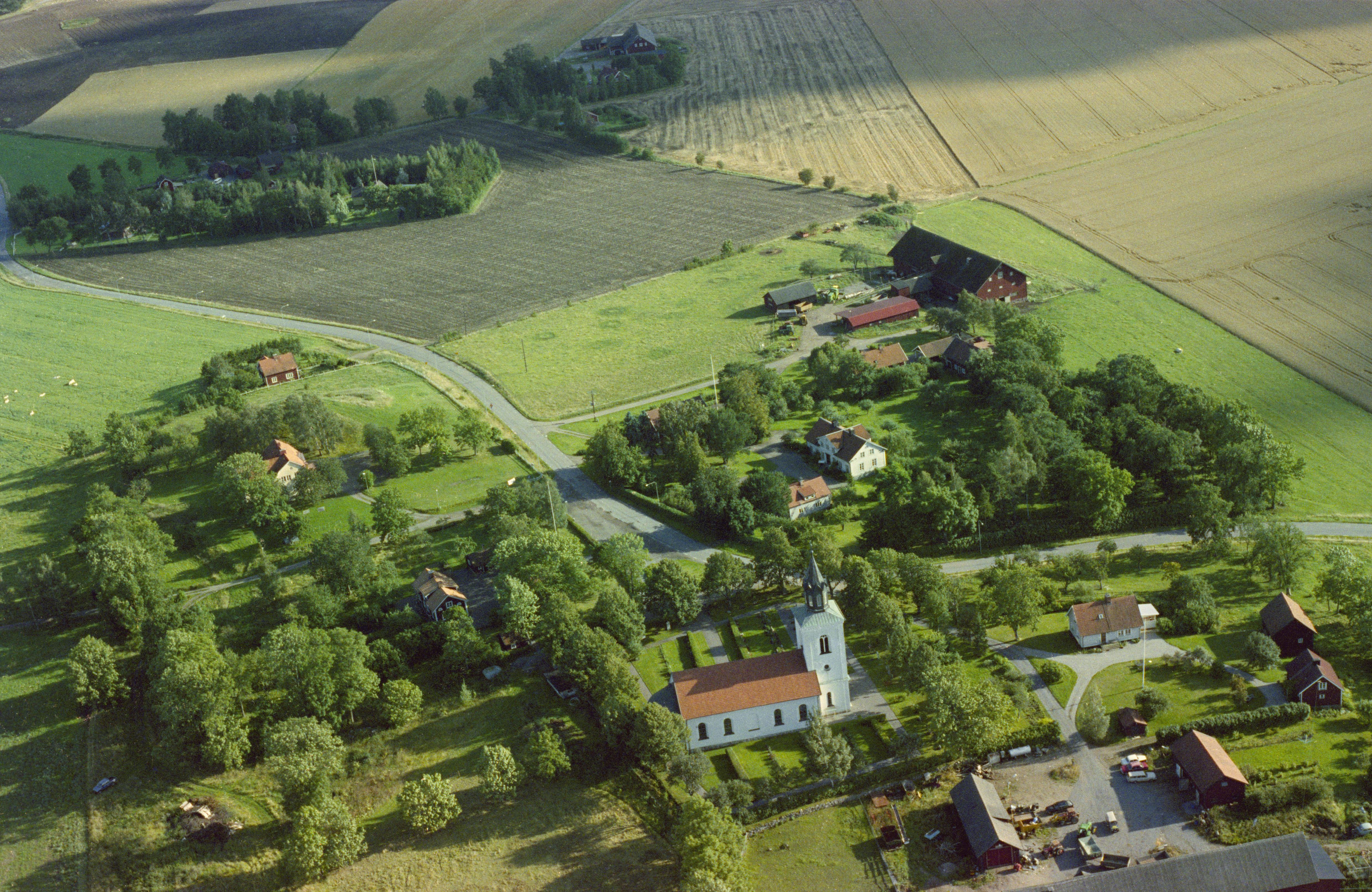 Beskrivning: Svartåns dalgång. Ledbergs kyrka och kyrkby. Bilden är tagen mot (väderstreck): S