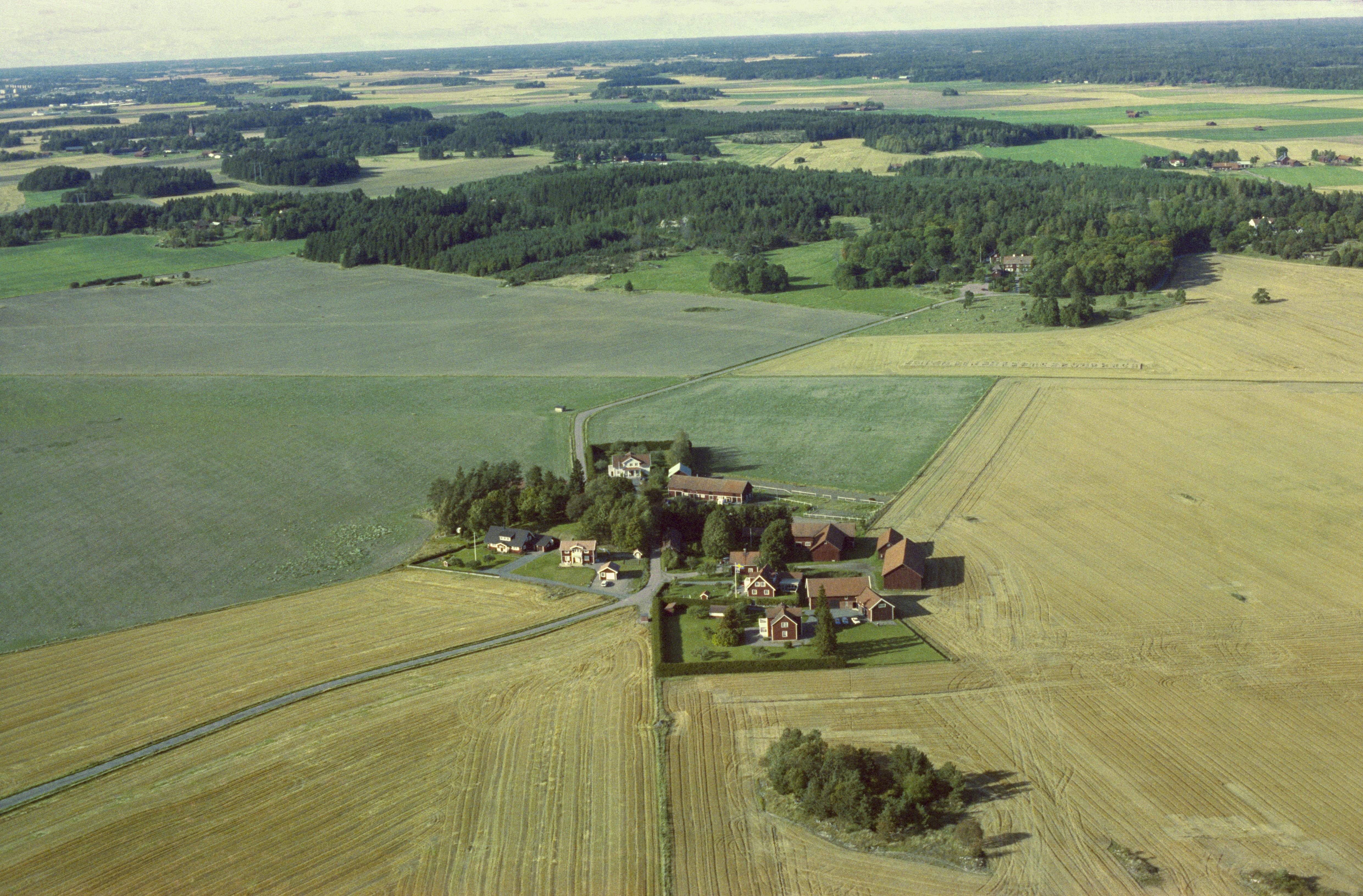 Beskrivning: Edeby gård. På västsidan av gården stensättning RAÄnr Danmark 96:1. I bildens övre del gården Linnés Hammarby. Bilden är tagen mot (väderstreck): NNV