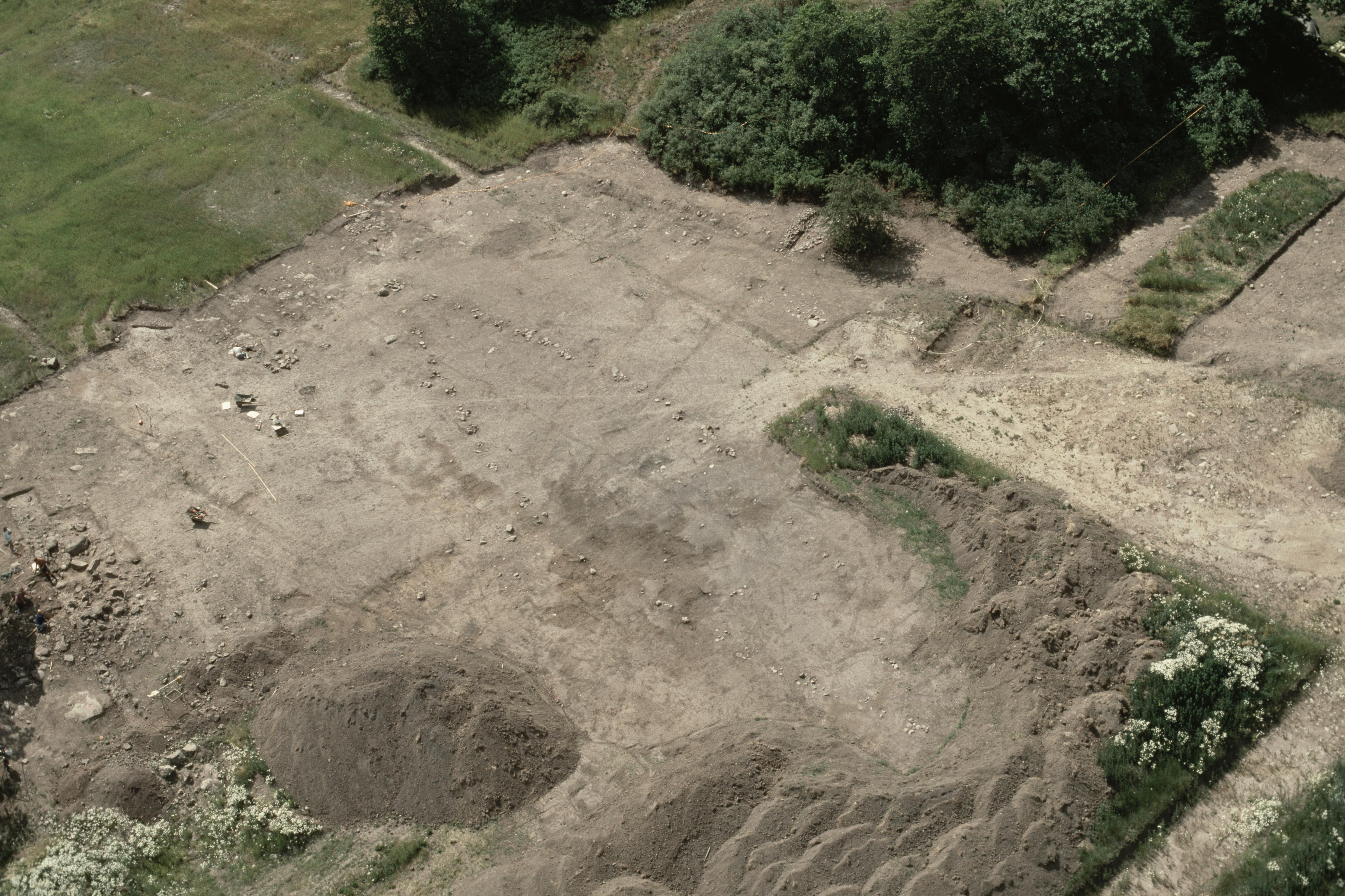 Beskrivning: Linköpings stad vid Stångebro i stadsdelen Kallerstad. Arkeologisk undersökning av skeppssättning vid Gumpekullastenen RAÄnr Linköping 143:1. Bilden är tagen mot (väderstreck): SV
