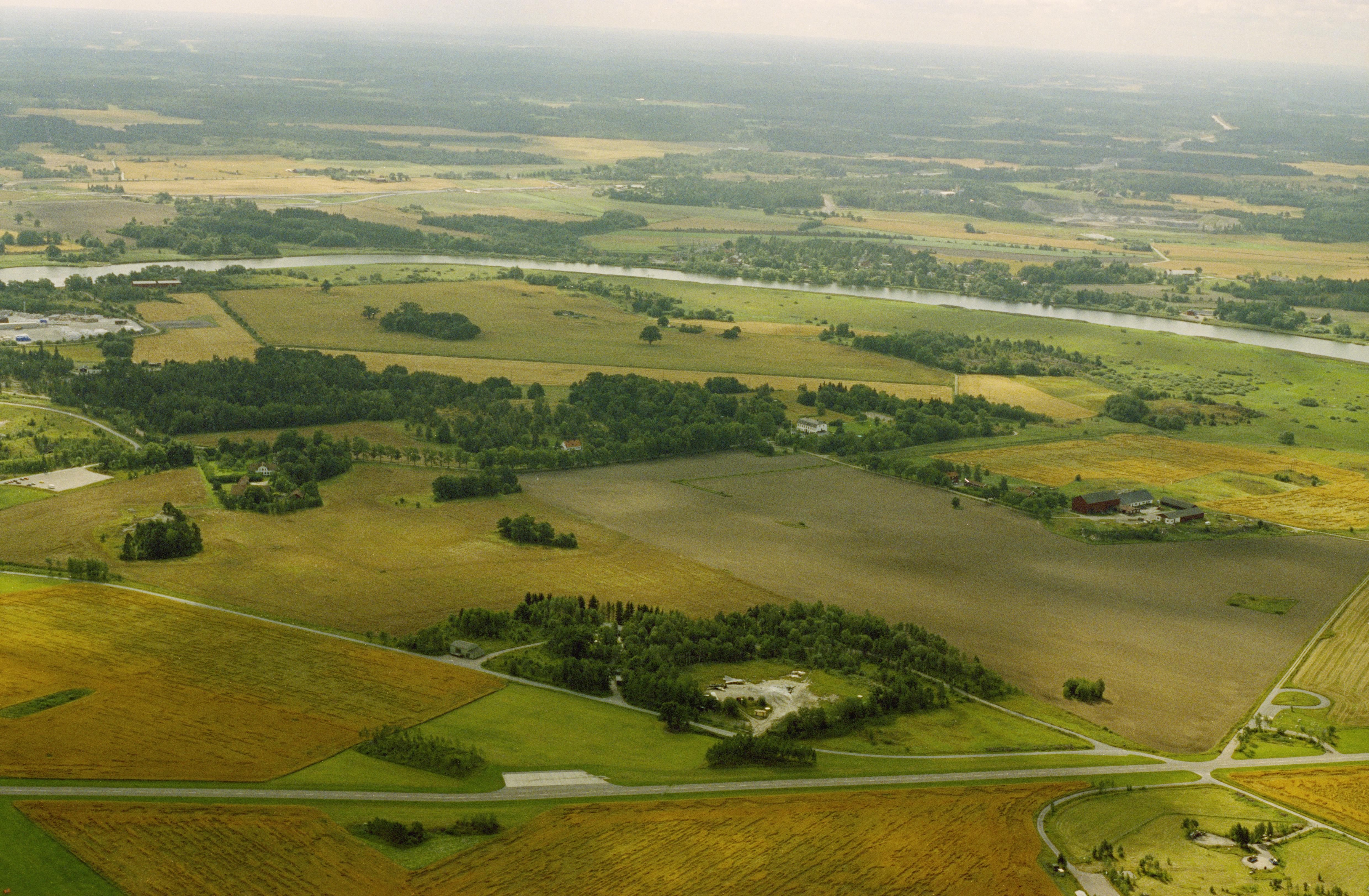 Beskrivning: (Tid. Östra Eneby socken). Hällristningar RAÄnr Östra Eneby 23:1, 29:1-3, 77:1-3, 156:1 m.fl. Nere till vänster gården Ekenberg och till höger Leonardsbergs herrgård. Motala ström i bildens övre del. Bilden är tagen mot (väderstreck): S