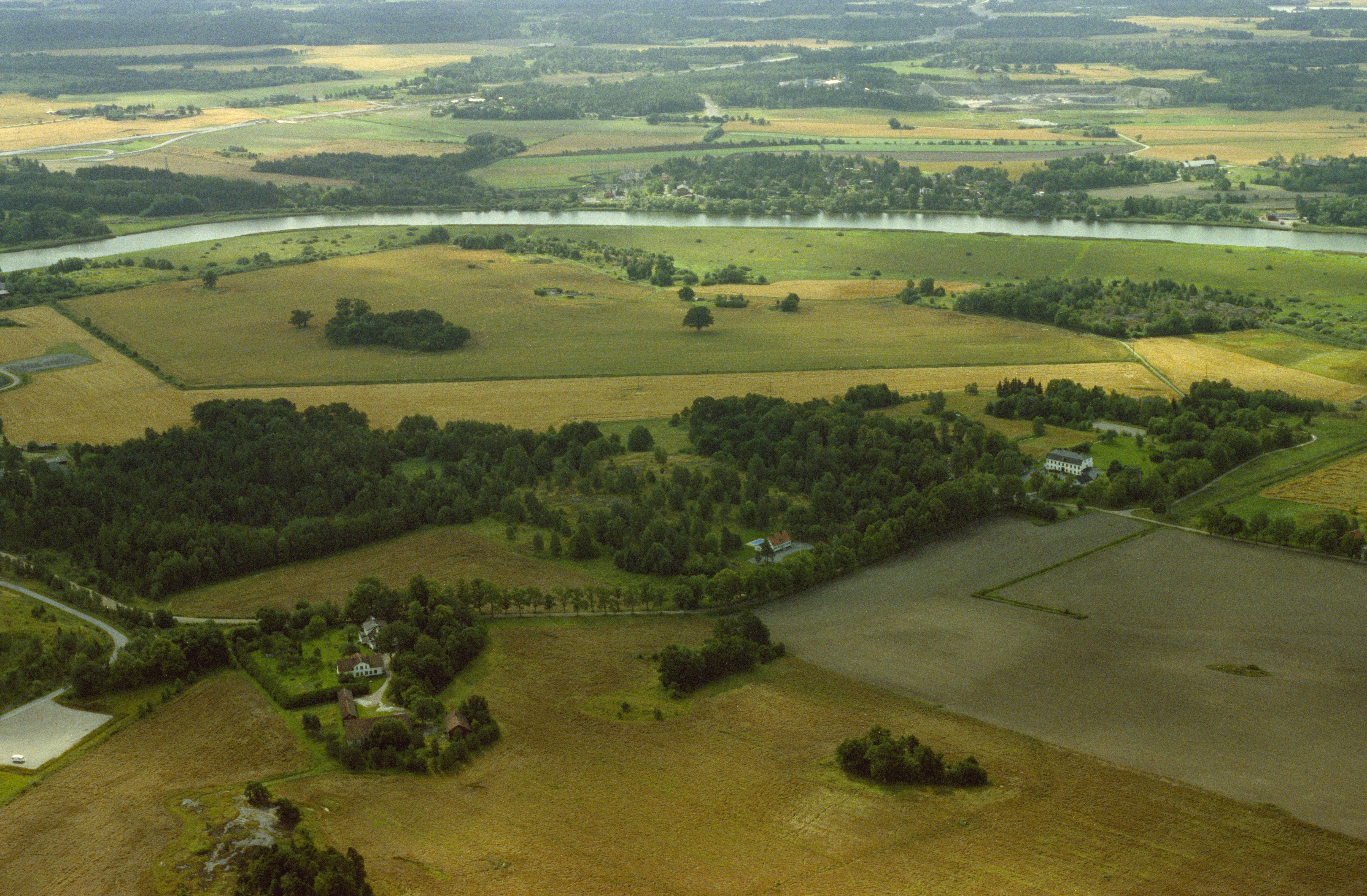 Beskrivning: (Tid. Östra Eneby socken). Hällristningar RAÄnr Östra Eneby 23:1, 29:1-3, 77:1-3, 156:1 m.fl. Nere till vänster gården Ekenberg och till höger Leonardsbergs herrgård. Motala ström i bildens övre del. Bilden är tagen mot (väderstreck): S
