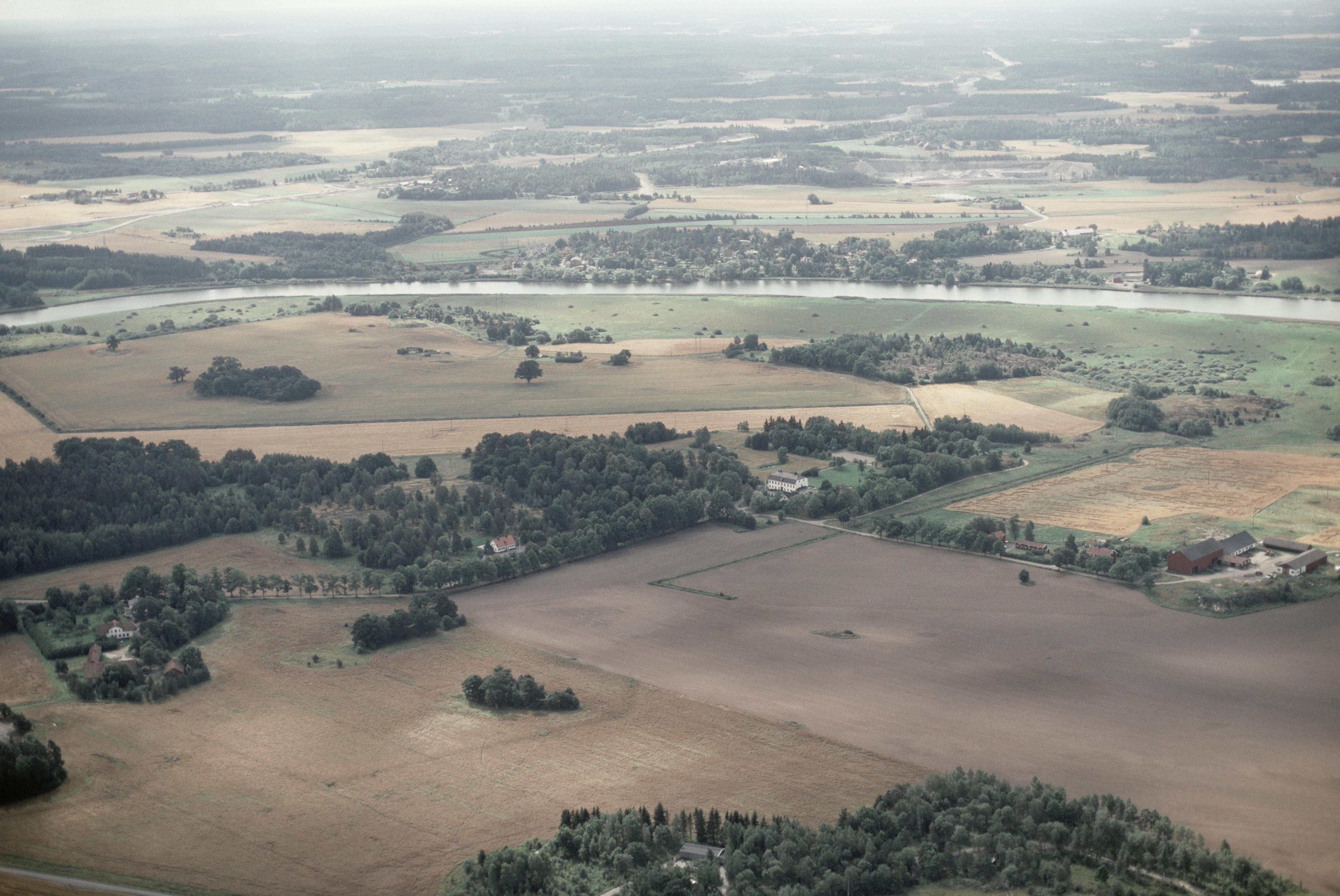 Beskrivning: (Tid. Östra Eneby socken). Hällristningar RAÄnr Östra Eneby 23:1, 29:1-3, 77:1-3, 156:1 m.fl. Nere till vänster gården Ekenberg och till höger Leonardsbergs herrgård. Motala ström i bildens övre del. Bilden är tagen mot (väderstreck): S
