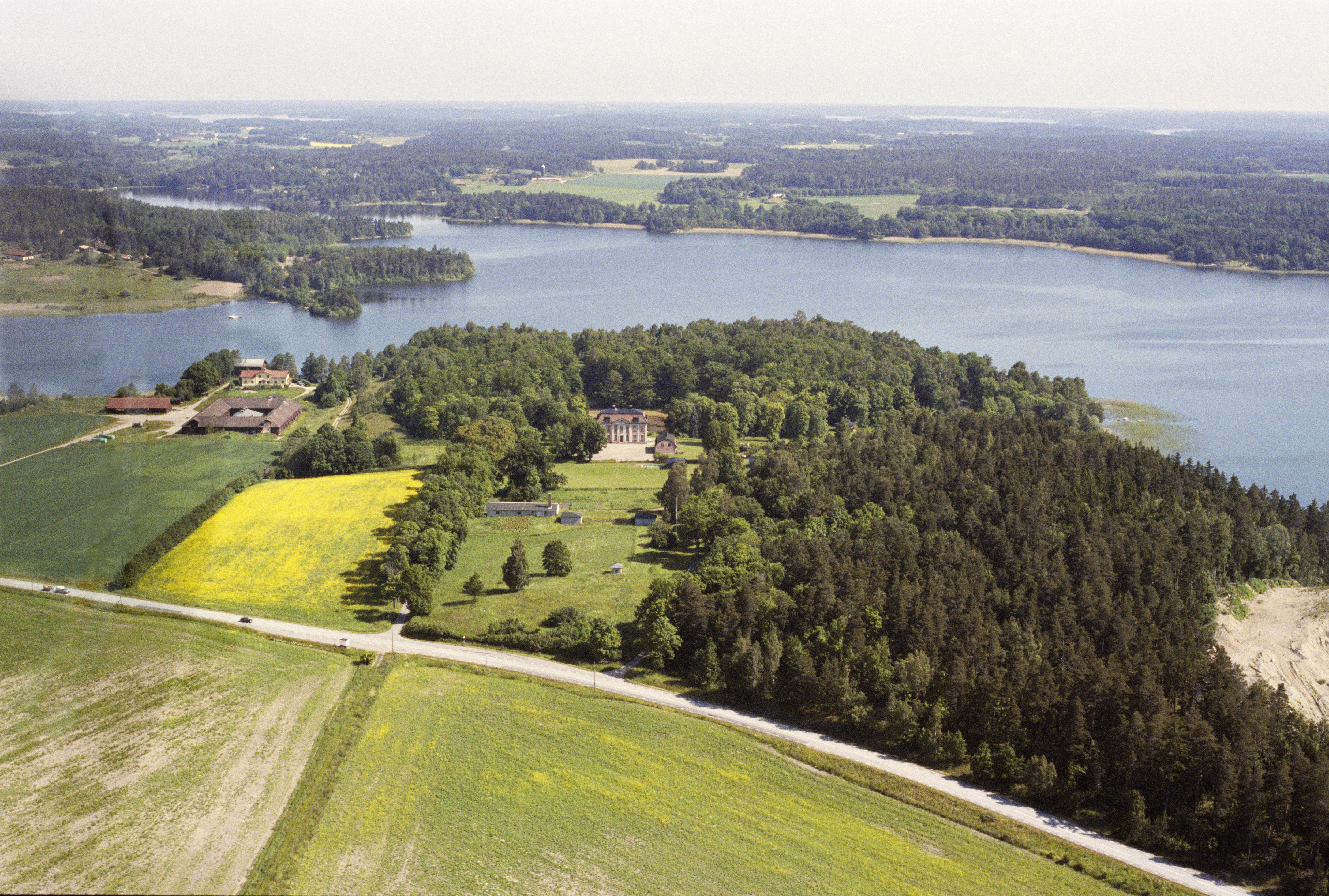 Beskrivning: Munsön i Mälaren, området Kärsön. Vid bildens mitt Kärsö herrgård (skrivs även Kersö herrgård) byggnadsminne RAÄnr Ekerö 199:1. Till vänster om bildens mitt viken Fladen. I bildens övre del fjärden Långtarmen mot socknen Munsö och Sånga. Bilden är tagen mot (vädersträck): NO