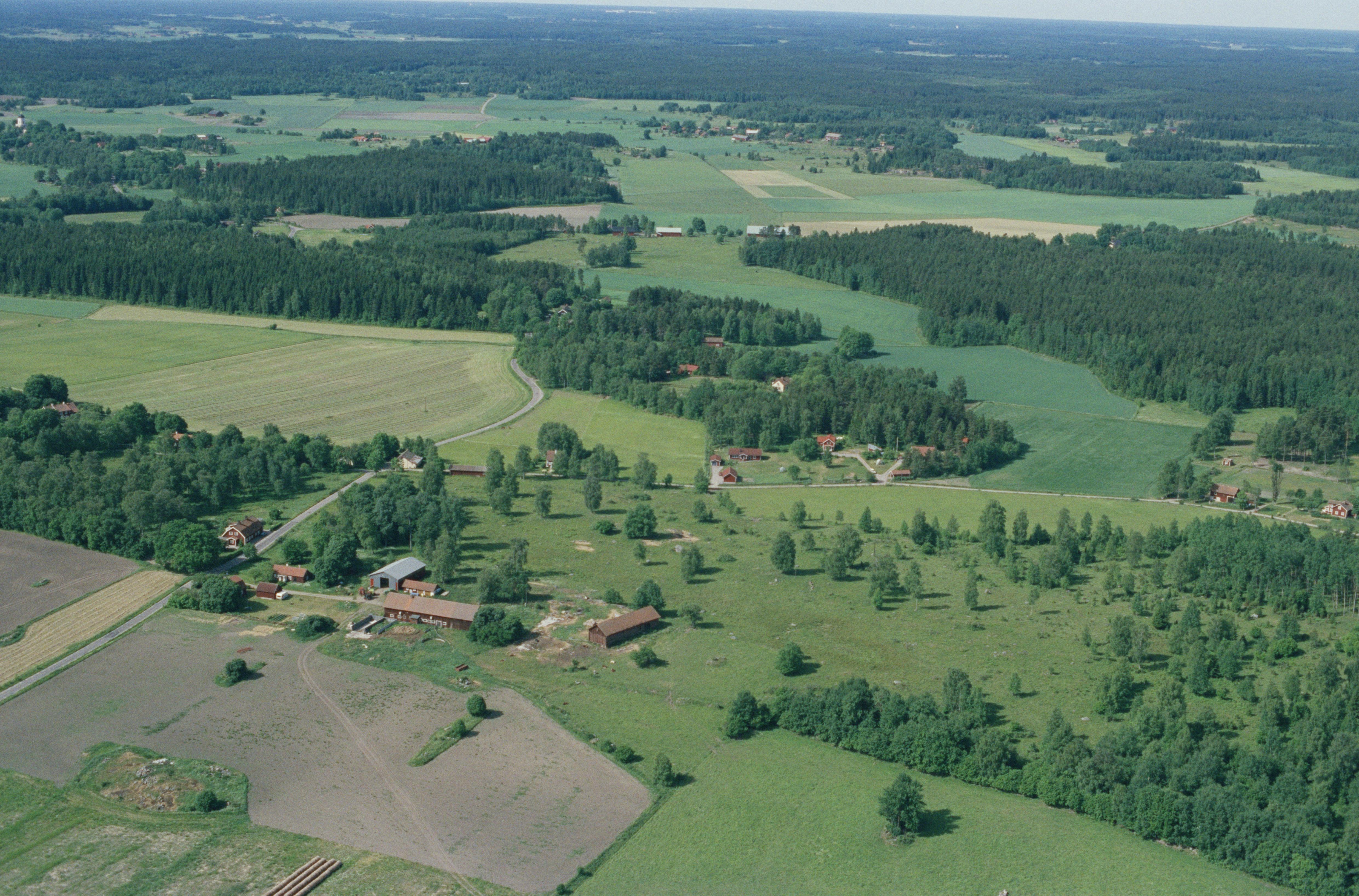 Beskrivning: Alby med gravfält RAÄnr Fasterna 92:1, 93:1, 94:1, 41:1 m.fl. Uppe till höger skogsområde med fornborg RAÄnr Fasterna 90:1. Bilden är tagen mot (väderstreck): SV