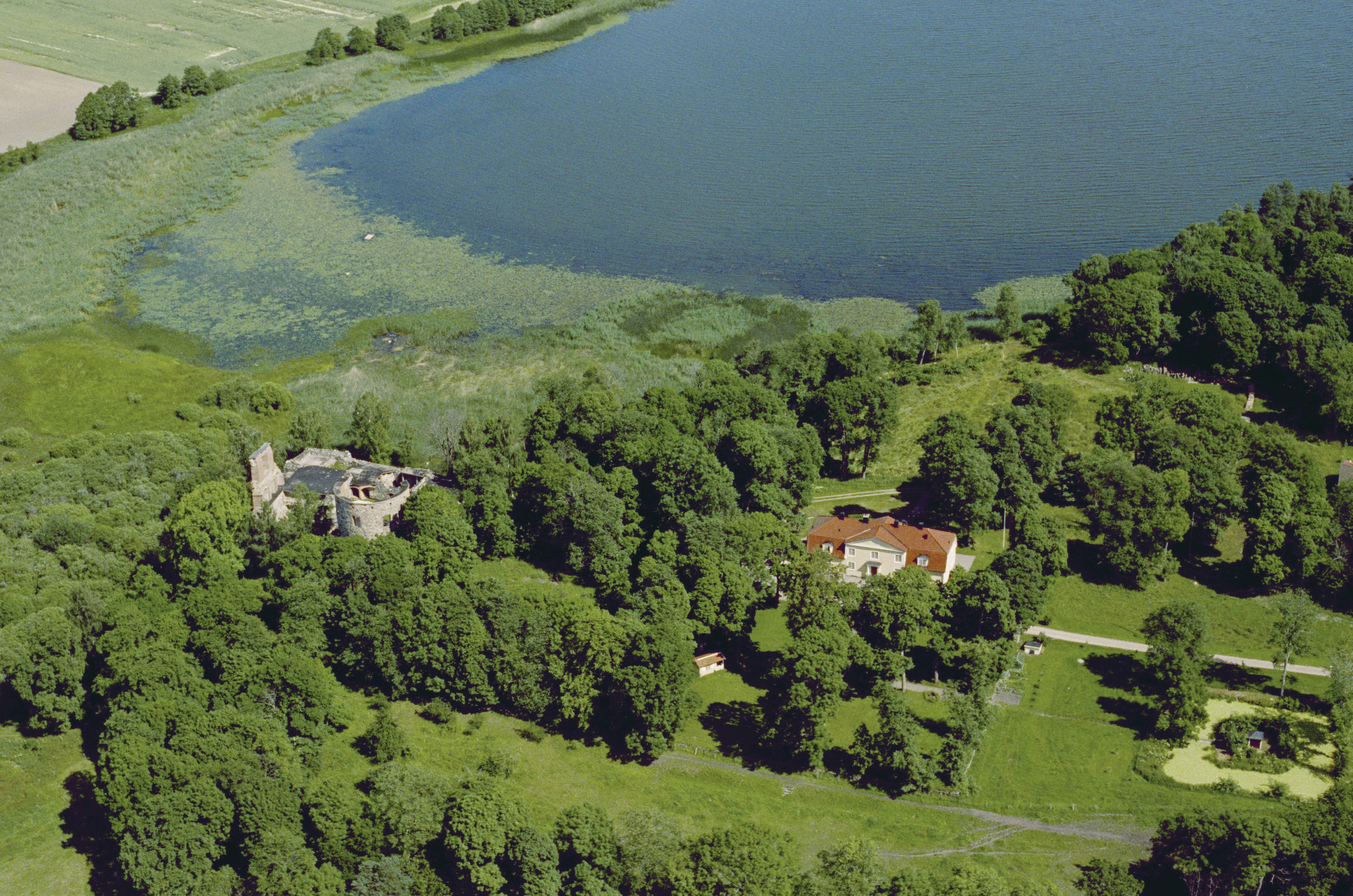 Beskrivning: Mörbyviken i sjön Skedviken. Mörby gård till höger om bildens mitt. Till vänster Mörby slottsruin RAÄnr Fasterna 49:1. Bilden är tagen mot (väderstreck): NO