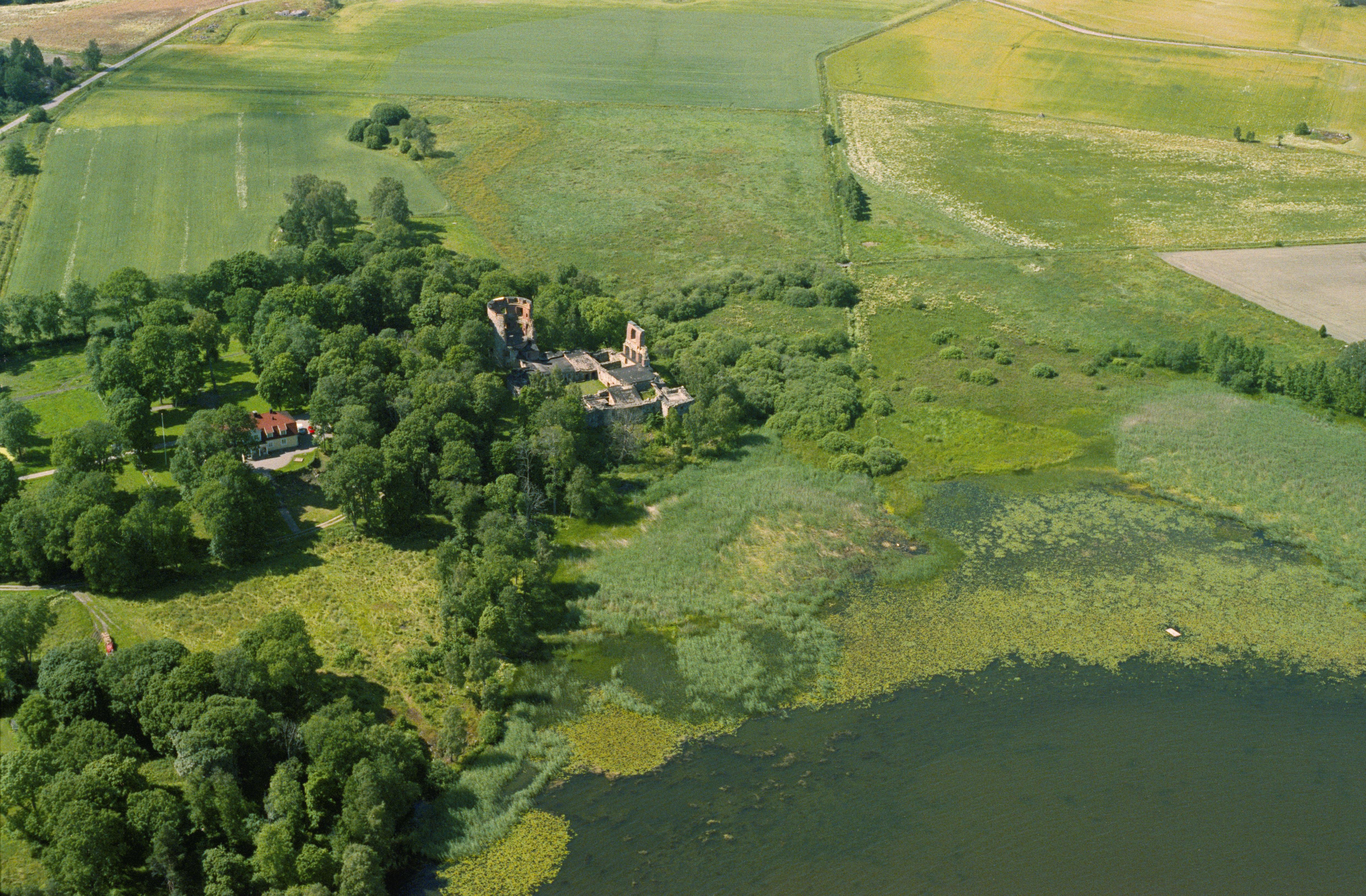 Beskrivning: Mörbyviken i sjön Skedviken. Till vänster om bildens mitt Mörby gård. Vid bildens mitt Mörby slottsruin RAÄnr Fasterna 49:1. Bilden är tagen mot (väderstreck): VNV