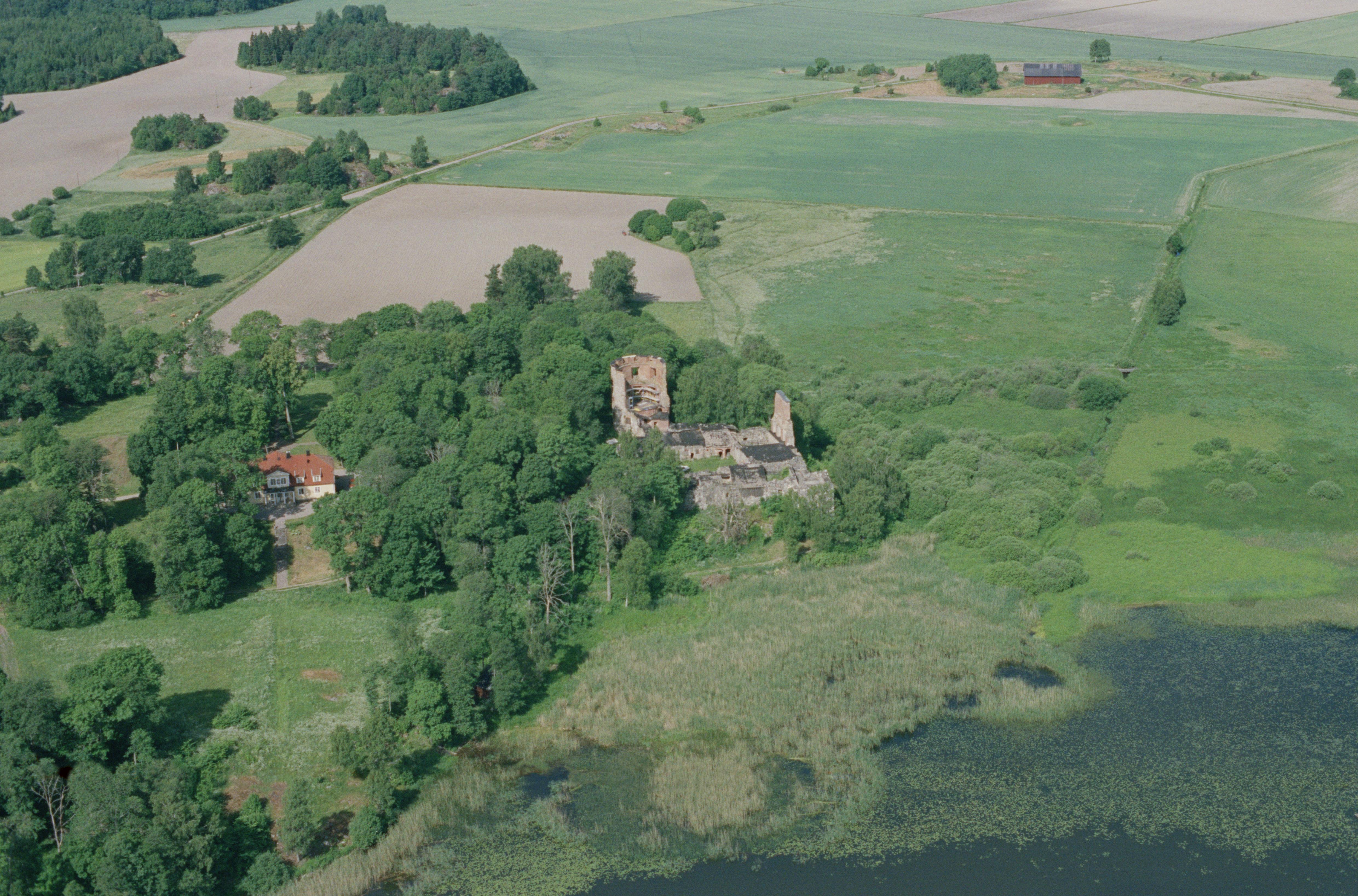 Beskrivning: Mörbyviken i sjön Skedviken. Till vänster om bildens mitt Mörby gård. Vid bildens mitt Mörby slottsruin RAÄnr Fasterna 49:1. Bilden är tagen mot (väderstreck): NV