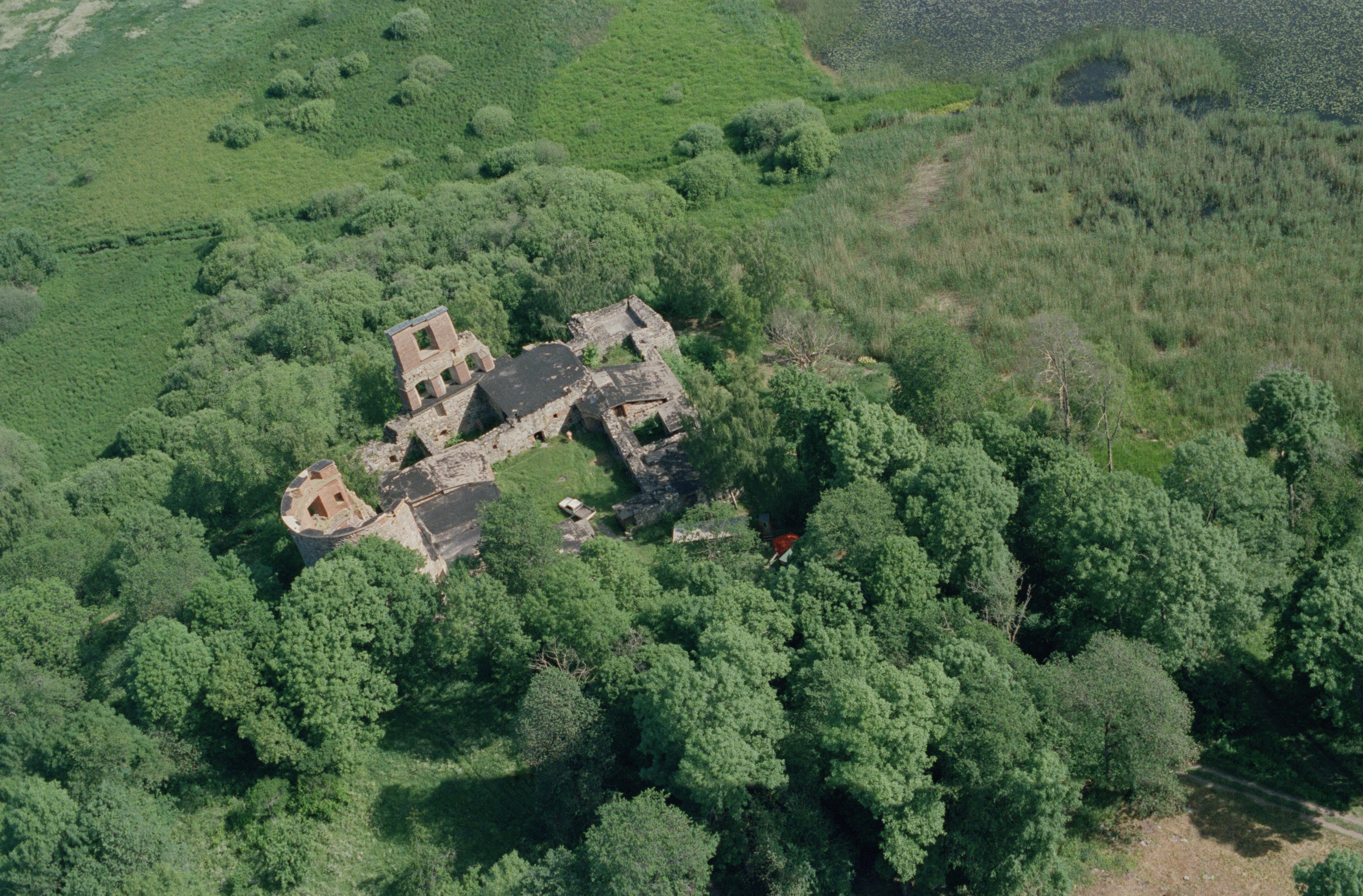 Beskrivning: Mörby slottsruin RAÄnr Fasterna 49:1 vid sjön Skedviken. Bilden är tagen mot (väderstreck): NNO