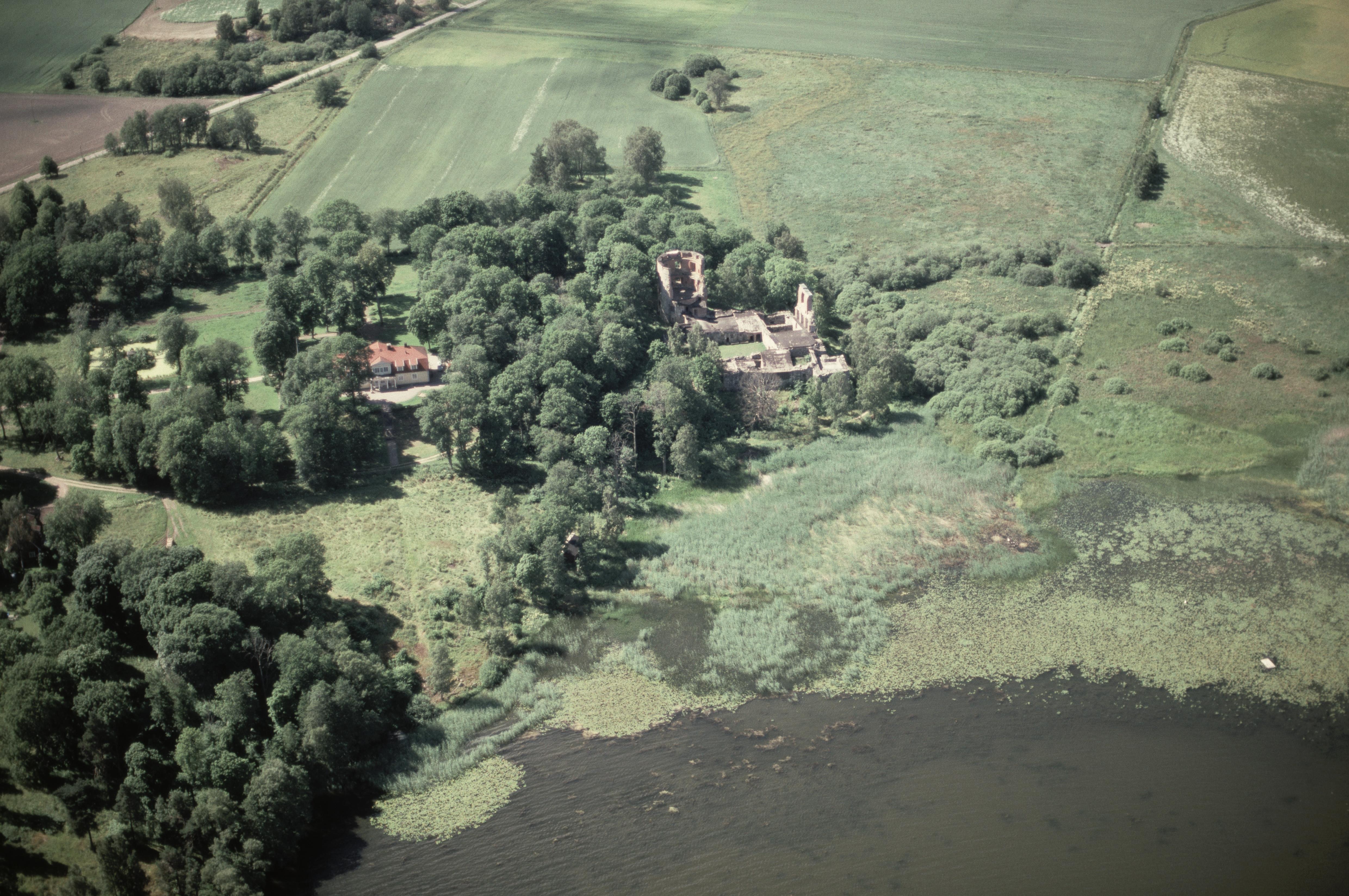 Beskrivning: Mörbyviken i sjön Skedviken. Mörby gård till vänster. Vid bildens mitt Mörby slottsruin RAÄnr Fasterna 49:1. Bilden är tagen mot (väderstreck): V