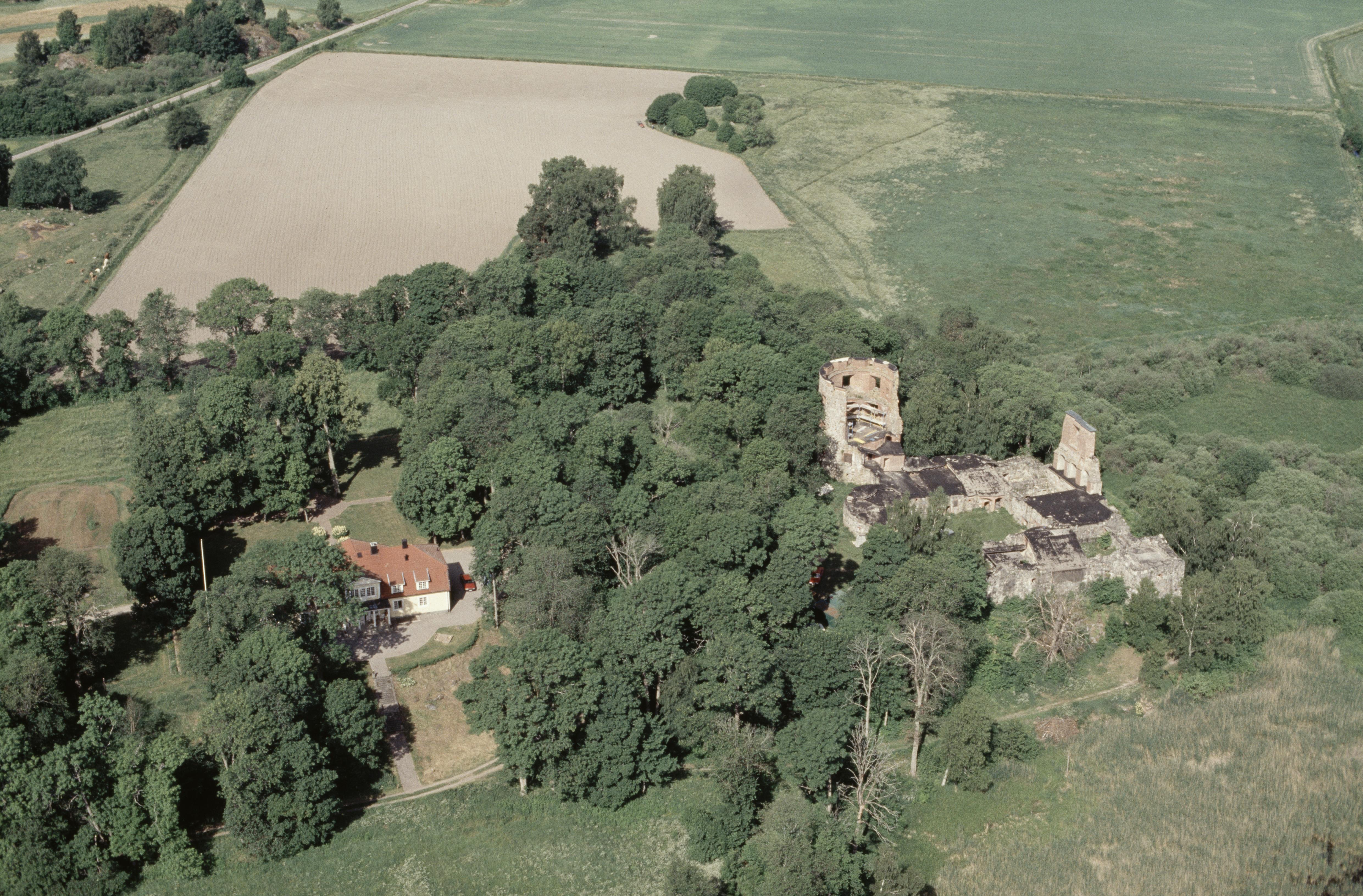 Beskrivning: Till vänster Mörby gård. Till höger Mörby slottsruin RAÄnr Fasterna 49:1 vid sjön Skedviken. Bilden är tagen mot (väderstreck): NV