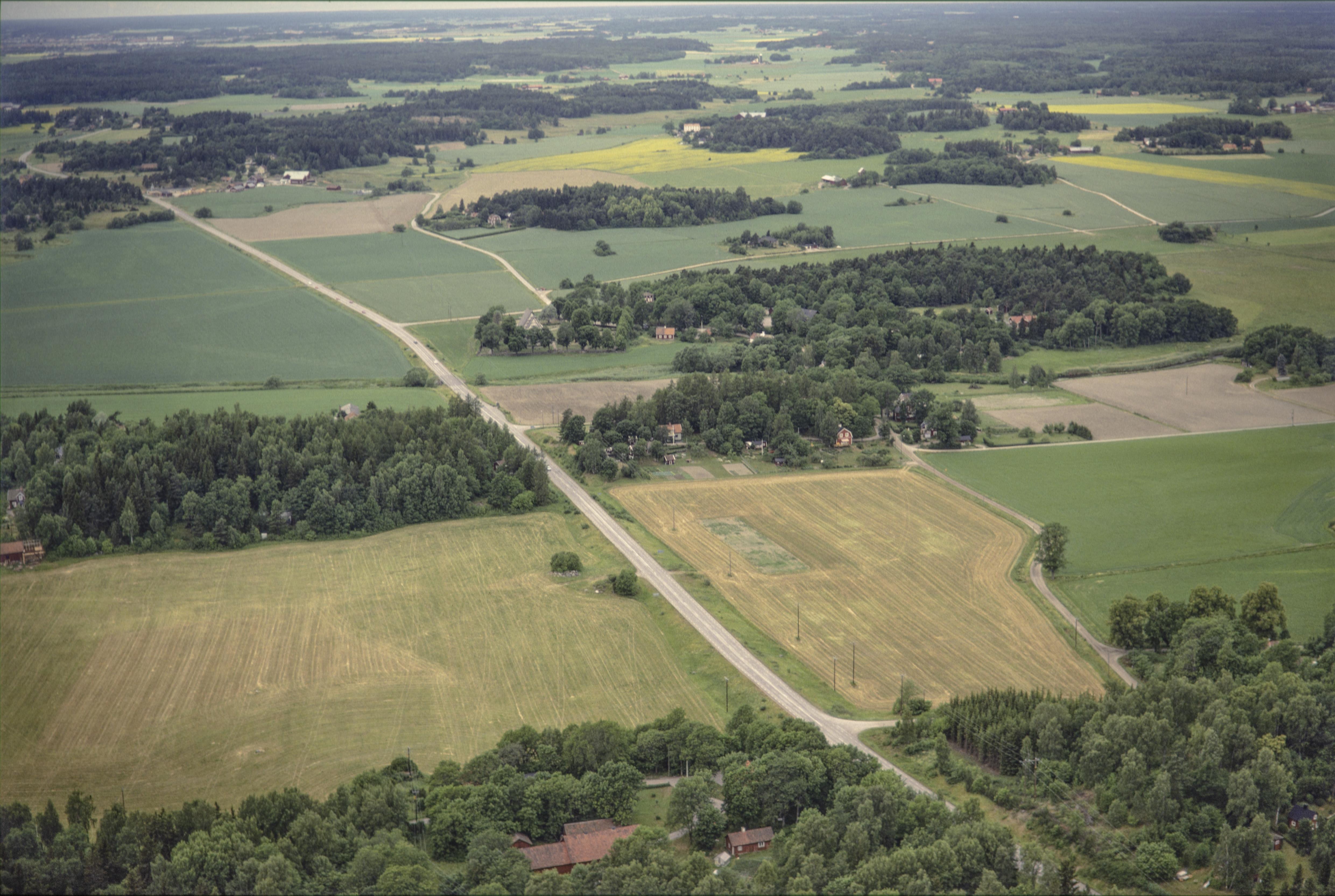 Beskrivning: Vid bildens mitt Funbo kyrka och kyrkby, museijärnväg och åmöte mellan Lillån och Funbyån. Bilden är tagen mot (väderstreck): VNV