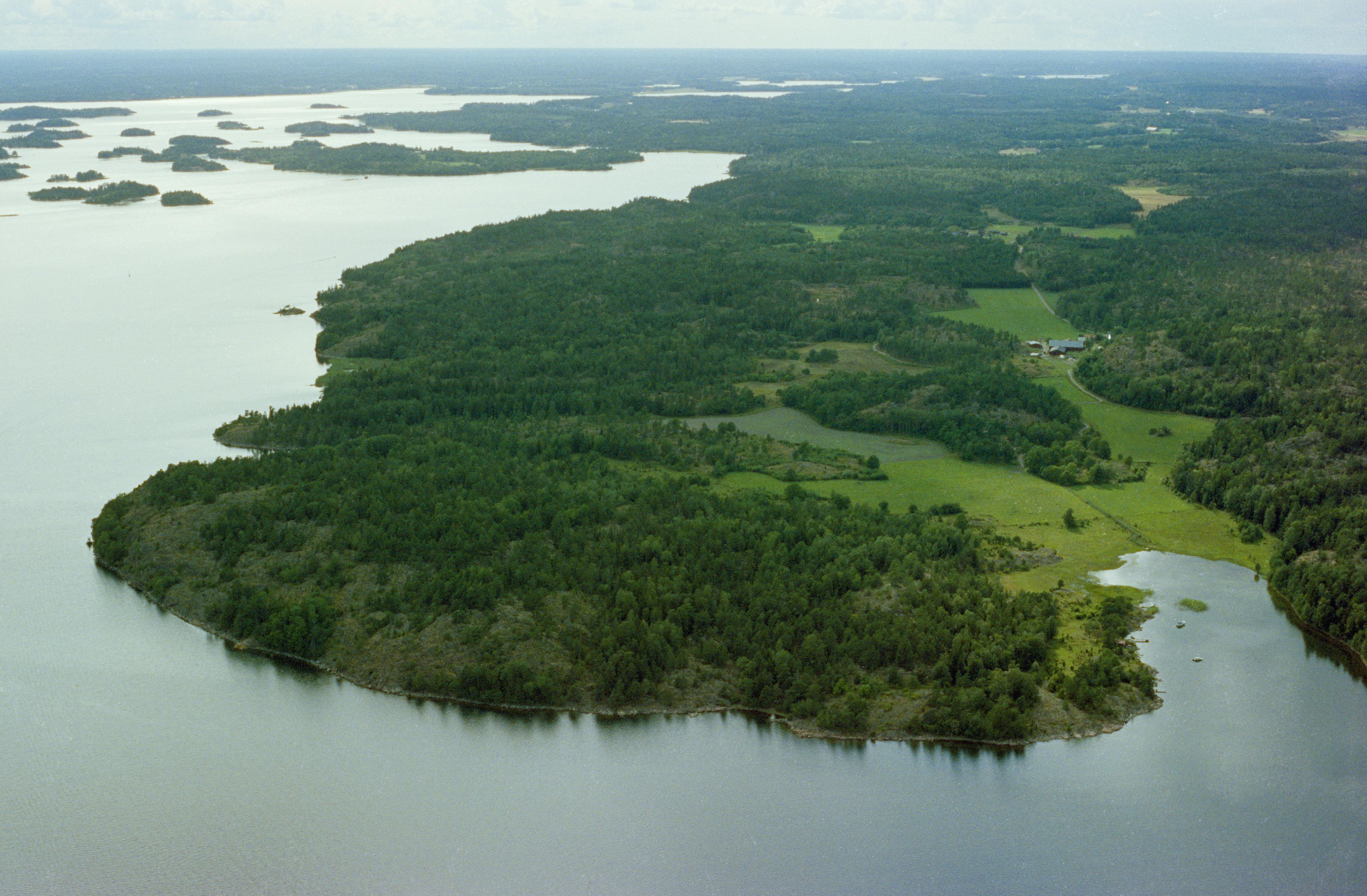 Beskrivning: Korpetorps by vid gränsen mot socknet Sankt Anna i Lönshuvudfjärden. Vårdkase RAÄnr Rönö 1:1 på udden Lönshuvud vid bildens mitt. Till höger boplatser Rönö 8:1, 33:1, 34:1, 35:1 m.fl. Bilden är tagen mot (väderstreck): SV