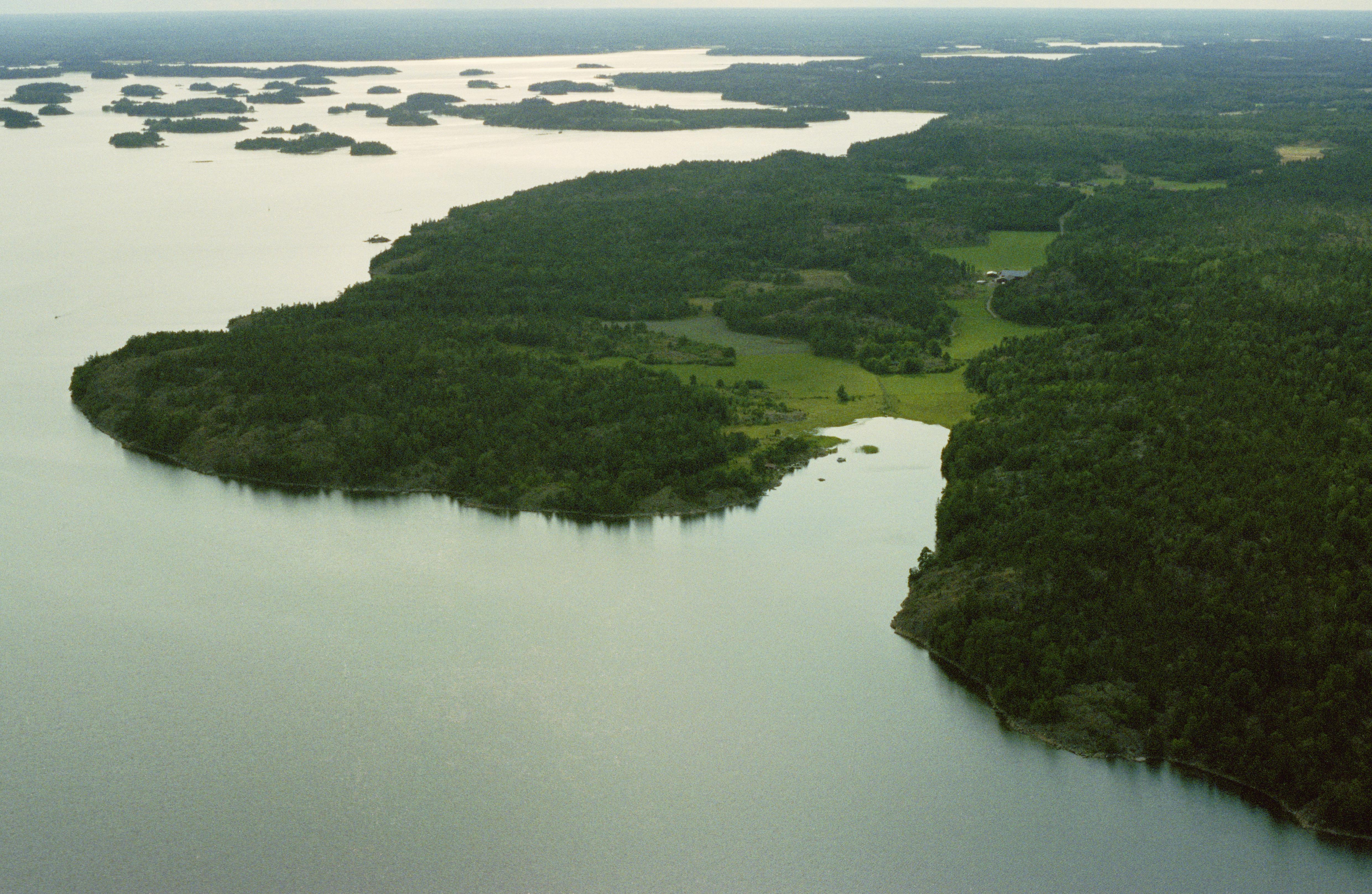 Beskrivning: Korpetorps by vid gränsen mot socknet Sankt Anna i Lönshuvudfjärden. Vårdkase RAÄnr Rönö 1:1 på udden Lönshuvud vid bildens mitt. Vid Korpetorp boplatser Rönö 8:1, 33:1, 34:1, 35:1 m.fl. Bilden är tagen mot (väderstreck): SV
