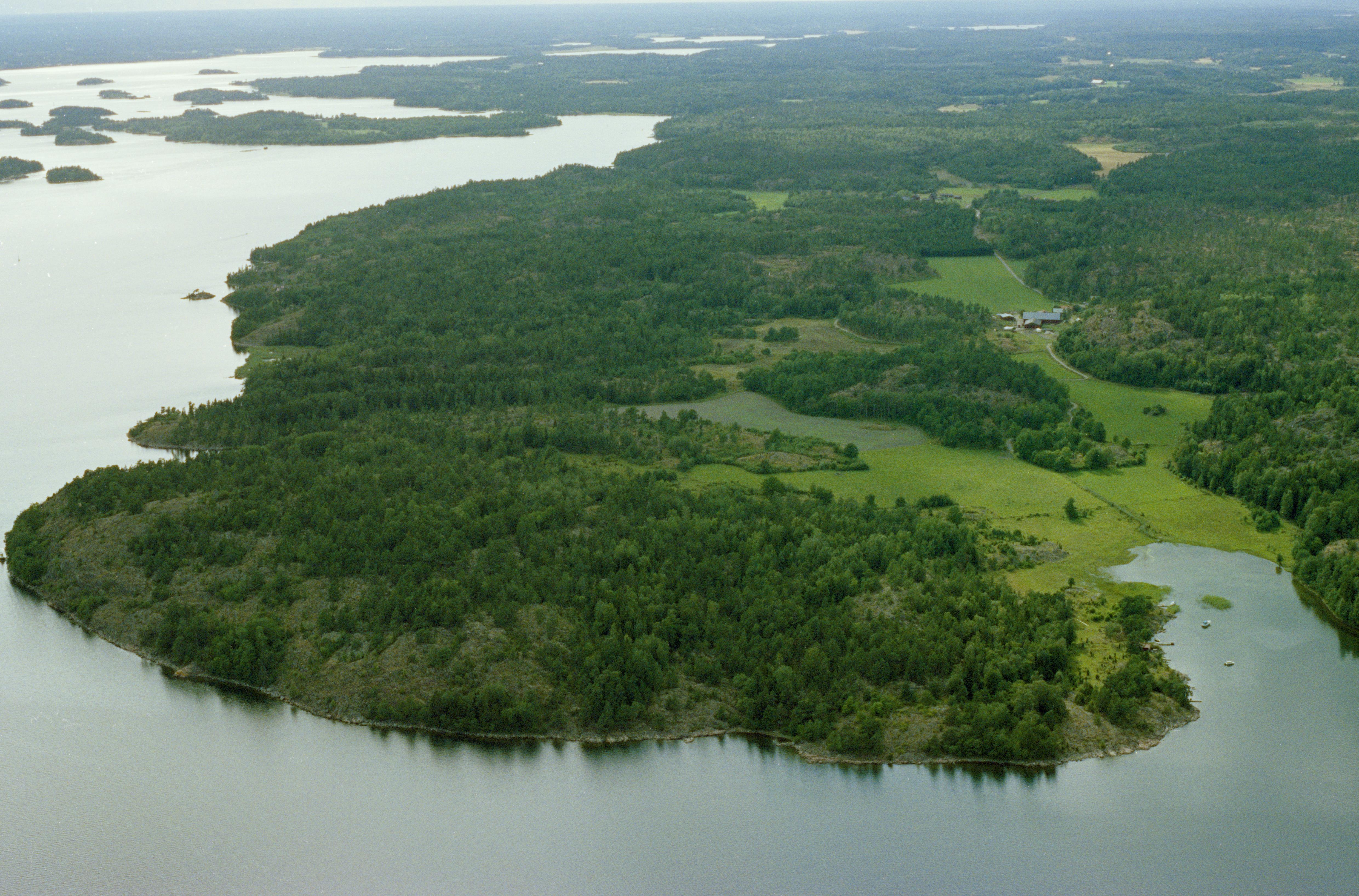 Beskrivning: Korpetorps by vid gränsen mot socknet Sankt Anna i Lönshuvudfjärden. Vårdkase RAÄnr Rönö 1:1 på udden Lönshuvud vid bildens mitt. Till höger boplatser Rönö 8:1, 33:1, 34:1, 35:1 m.fl. Bilden är tagen mot (väderstreck): SV