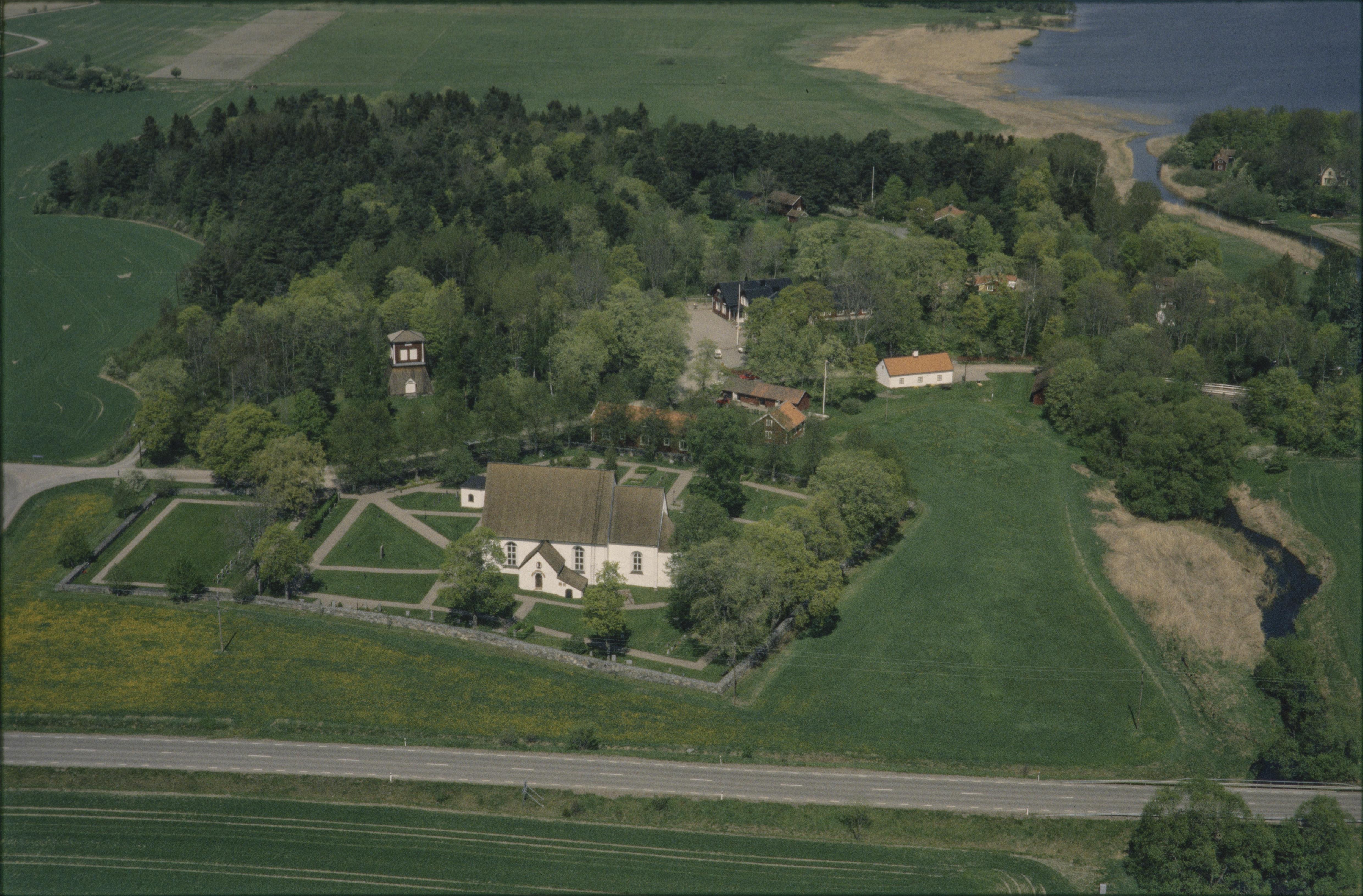 Beskrivning: Funbo kyrka vid Funboån. Funbosjön uppe till höger. Bilden är tagen mot (väderstreck): N