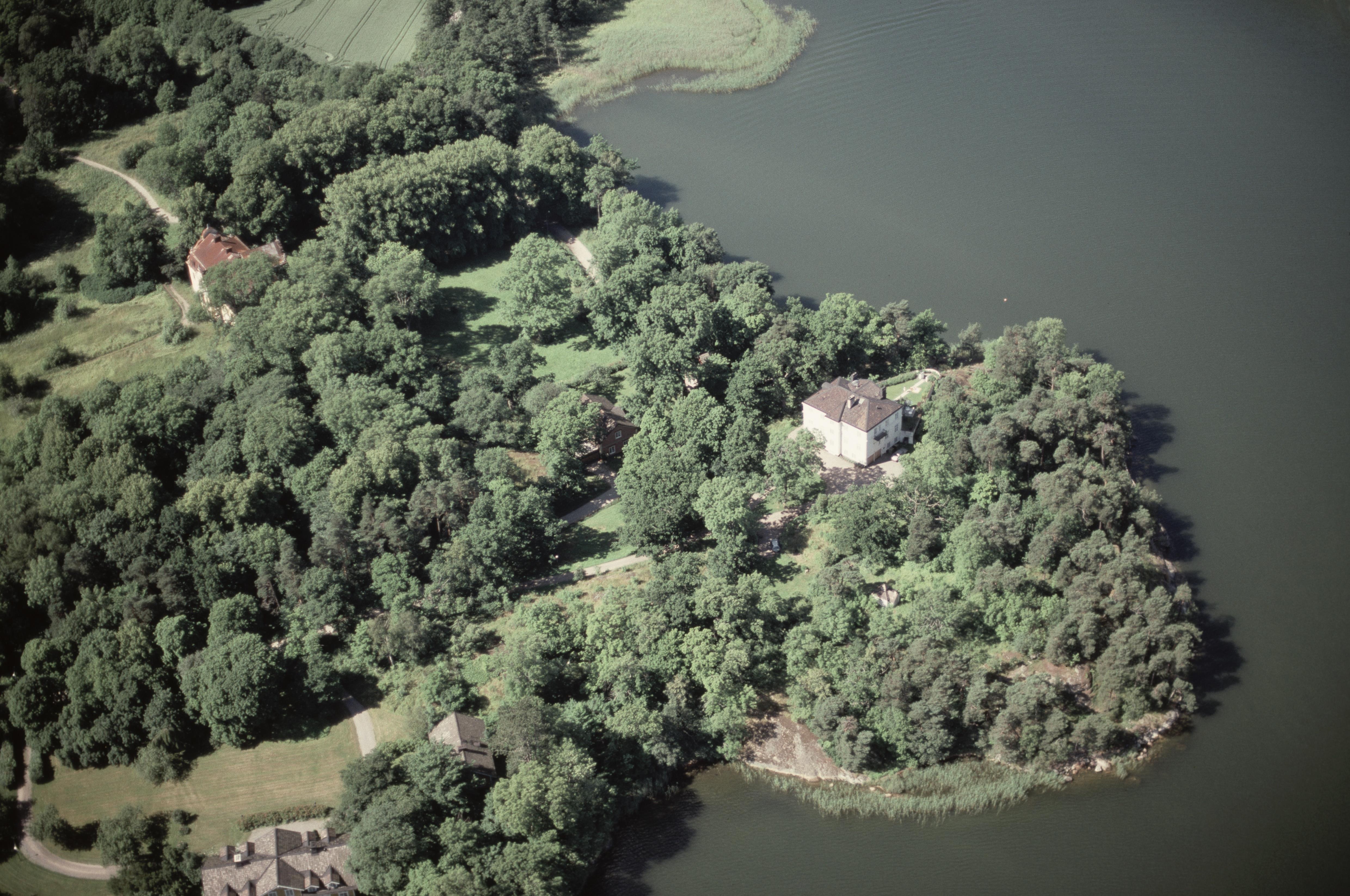 Beskrivning: Vid bildens mitt bytomt Farsta gårdstomt RAÄnr Gustavsberg 42:1. Uppe till vänster Farsta slott. Till höger Villa Farsta Udde vid Farstavikens södra strand. Bilden är tagen mot (väderstreck): VSV