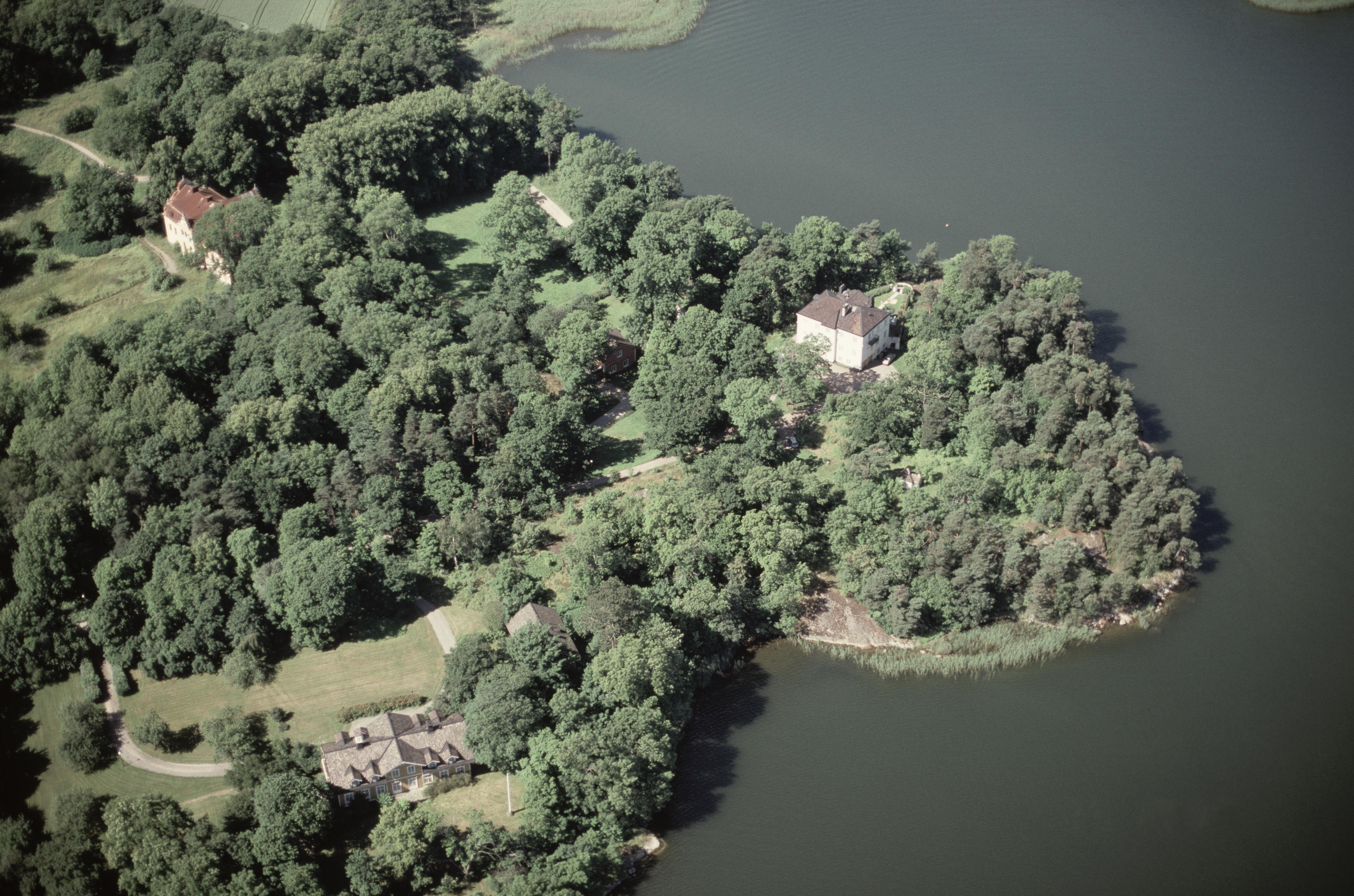 Beskrivning: Vid bildens mitt bytomt Farsta gårdstomt RAÄnr Gustavsberg 42:1. Uppe till vänster Farsta slott. Till höger Villa Farsta Udde vid Farstavikens södra strand. Bilden är tagen mot (väderstreck): VSV