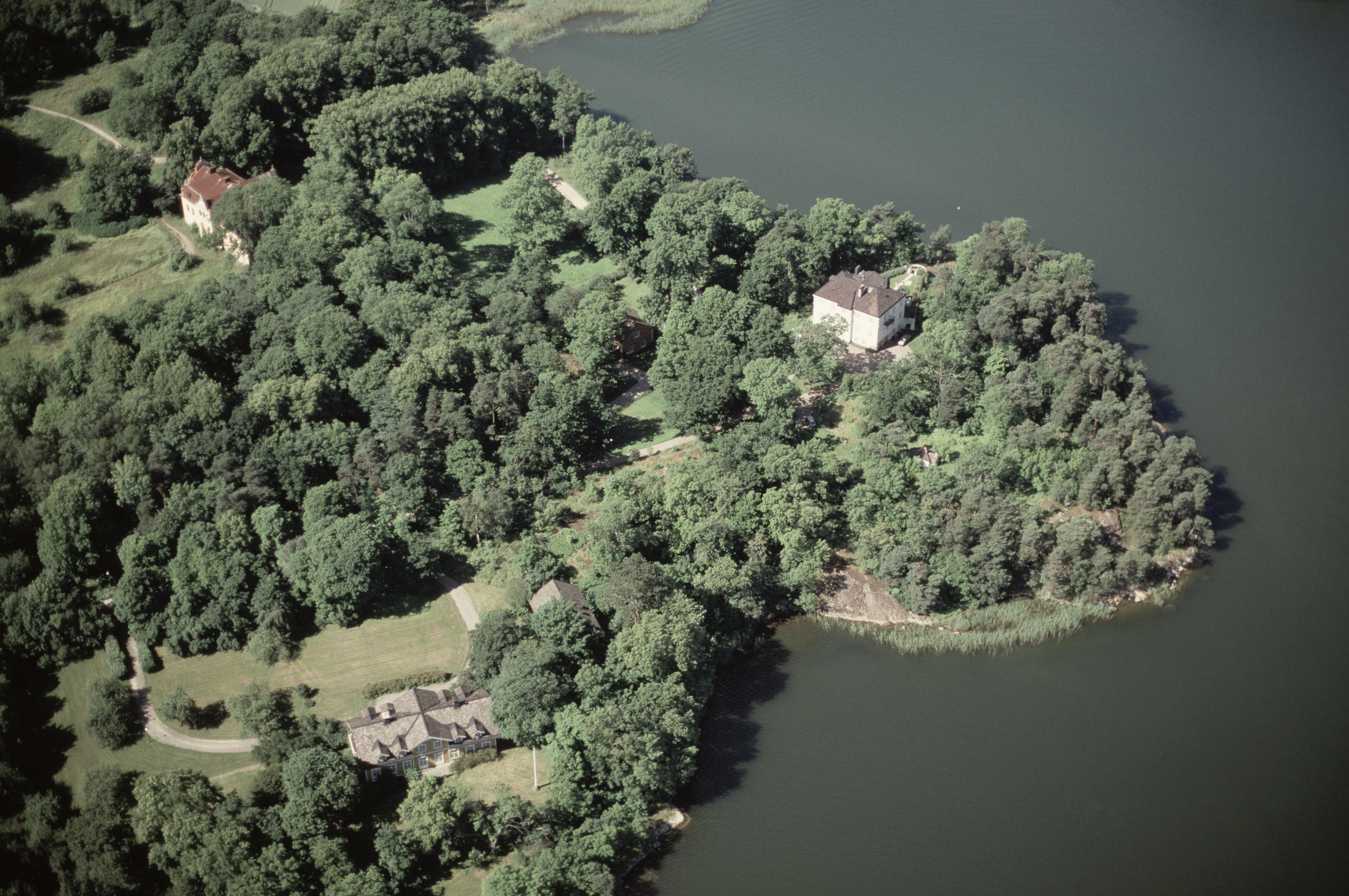 Beskrivning: Vid bildens mitt bytomt Farsta gårdstomt RAÄnr Gustavsberg 42:1. Uppe till vänster Farsta slott. Till höger Villa Farsta Udde vid Farstavikens södra strand. Bilden är tagen mot (väderstreck): VSV