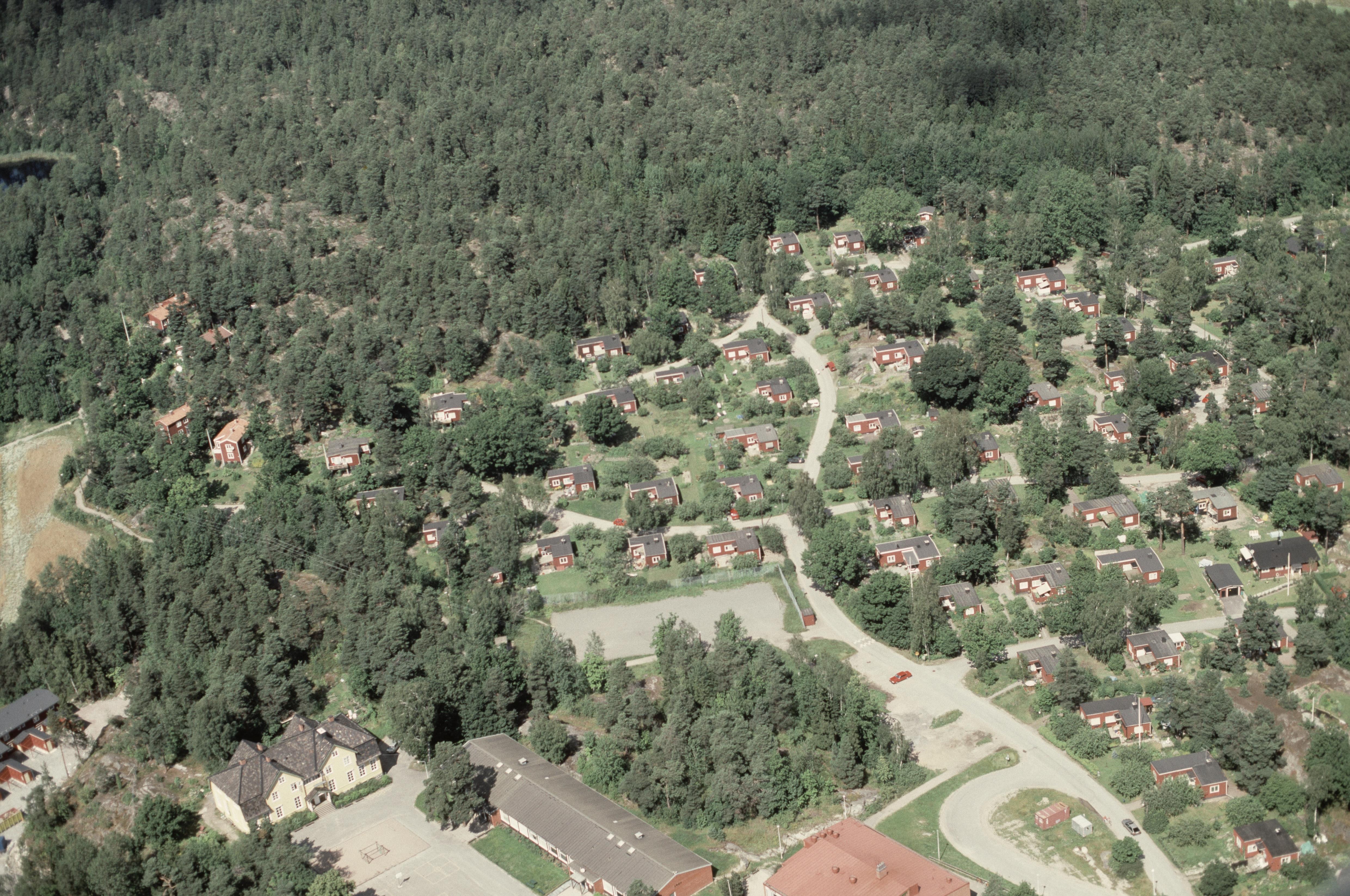 Beskrivning: Bostadsområdet Höjdhagen i Gustavsbergs tätort. Hällristning RAÄnr Gustavsberg 31:1 vid Ekedalsskolan i bildens nedre del. Bilden är tagen mot (väderstreck): N