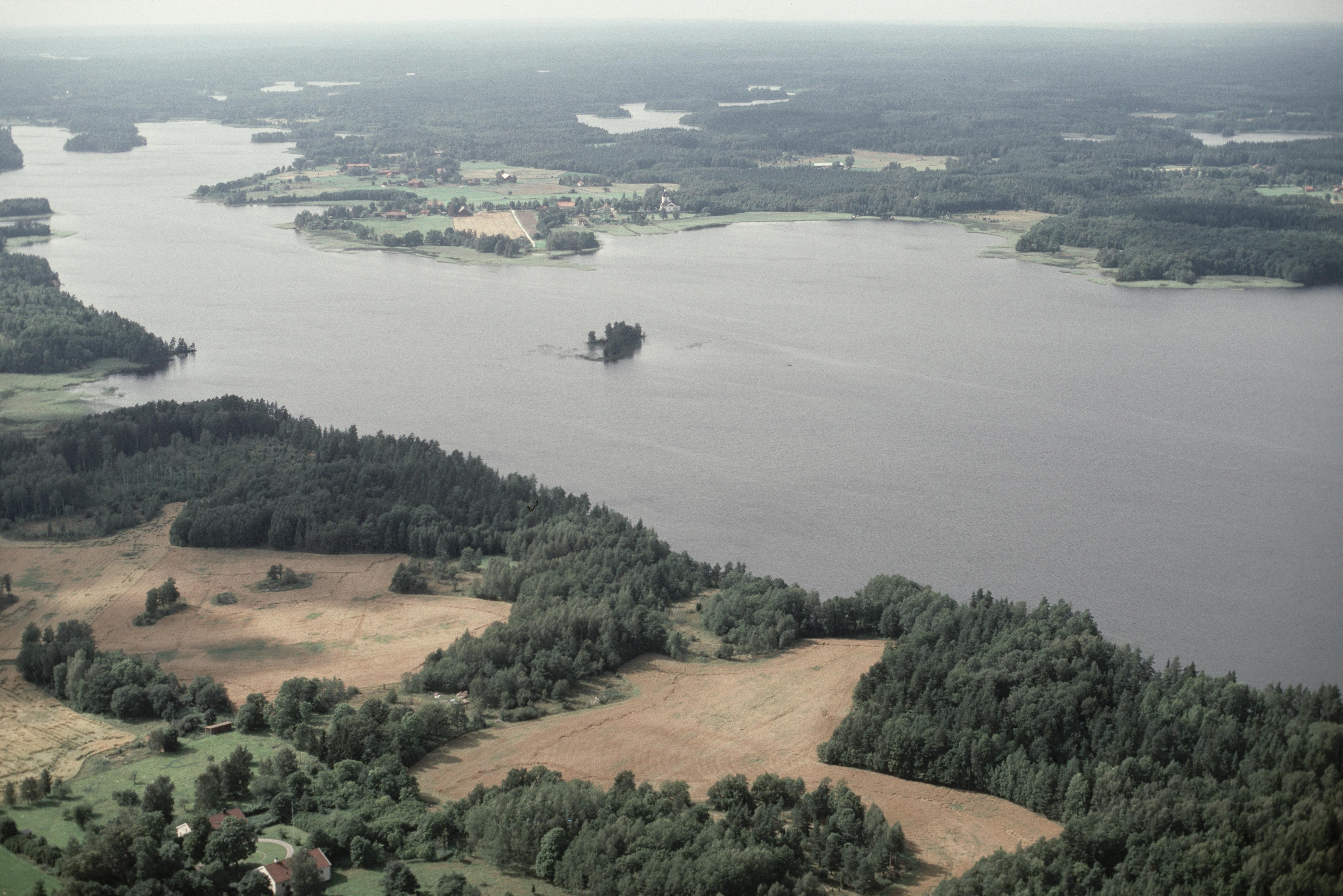 Beskrivning: Sjön Tisnaren. Vid bildens mitt Karls holme. I bildens övre del Skedevi kyrka RAÄnr Skedevi 155:1 och kyrkby. Bilden är tagen mot (väderstreck): VNV