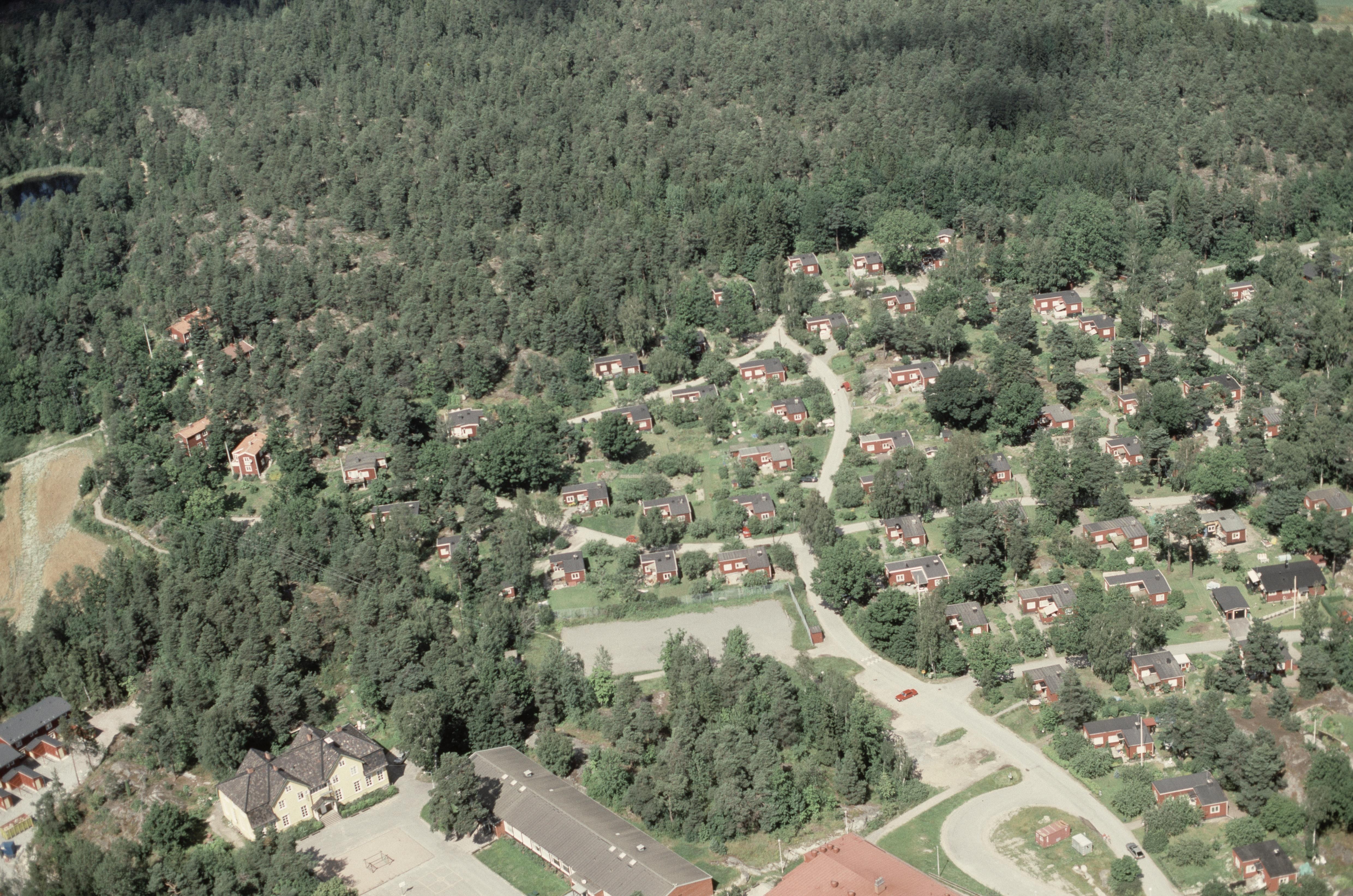 Beskrivning: Bostadsområdet Höjdhagen i Gustavsbergs tätort. Hällristning RAÄnr Gustavsberg 31:1 vid Ekedalsskolan i bildens nedre del. Bilden är tagen mot (väderstreck): N