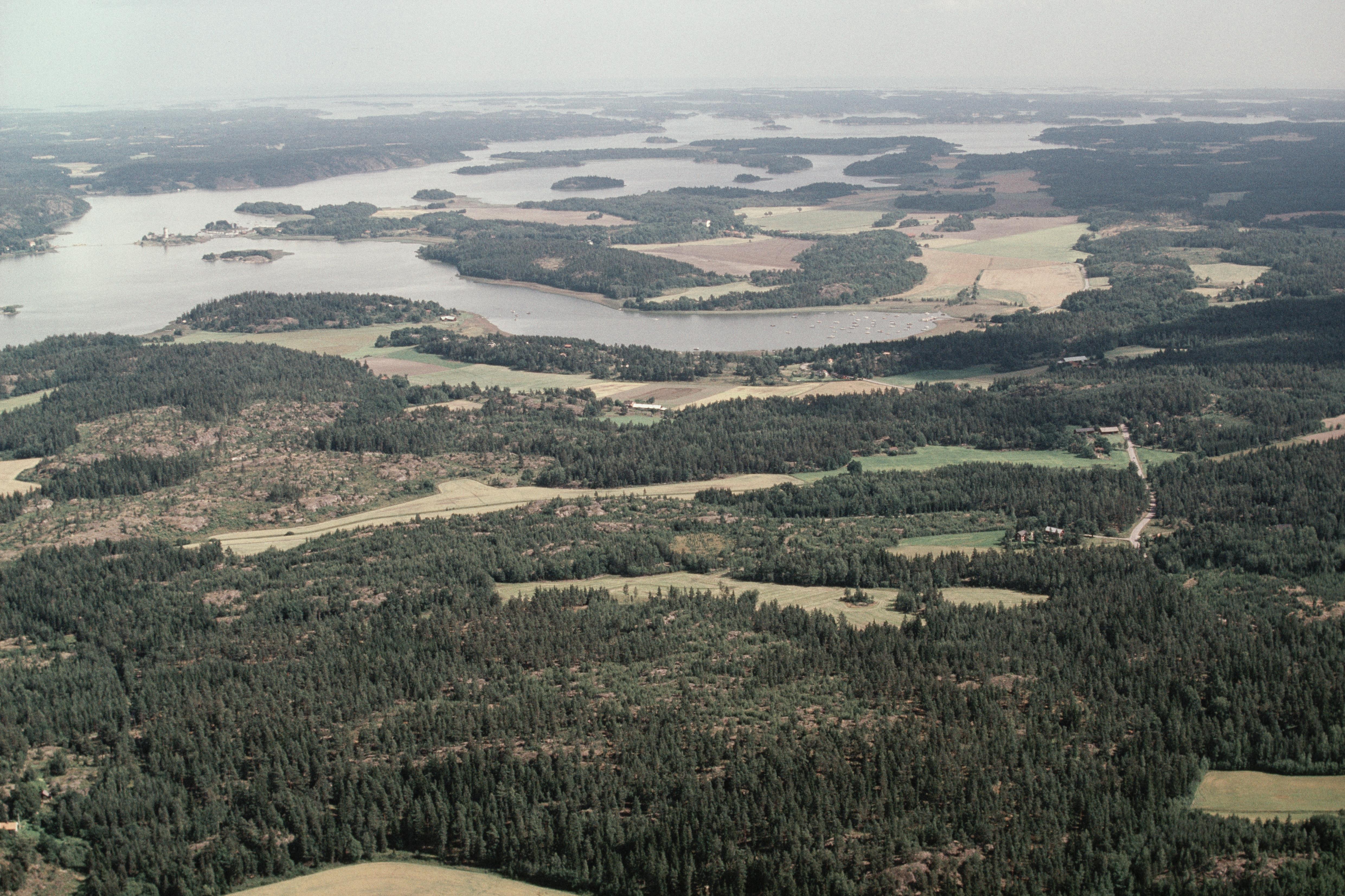 Beskrivning: Bebyggelselämningar i Borum RAÄnr Mogata 139:1 vid bildens mitt. I bildens övre del havsviken Slätbaken, Merumsfjärden och socknet Skällvik med Stegeborgs slottsruin RAÄnr Skällvik 222:1 uppe till vänster. Bilden är tagen mot (väderstreck): OSO
