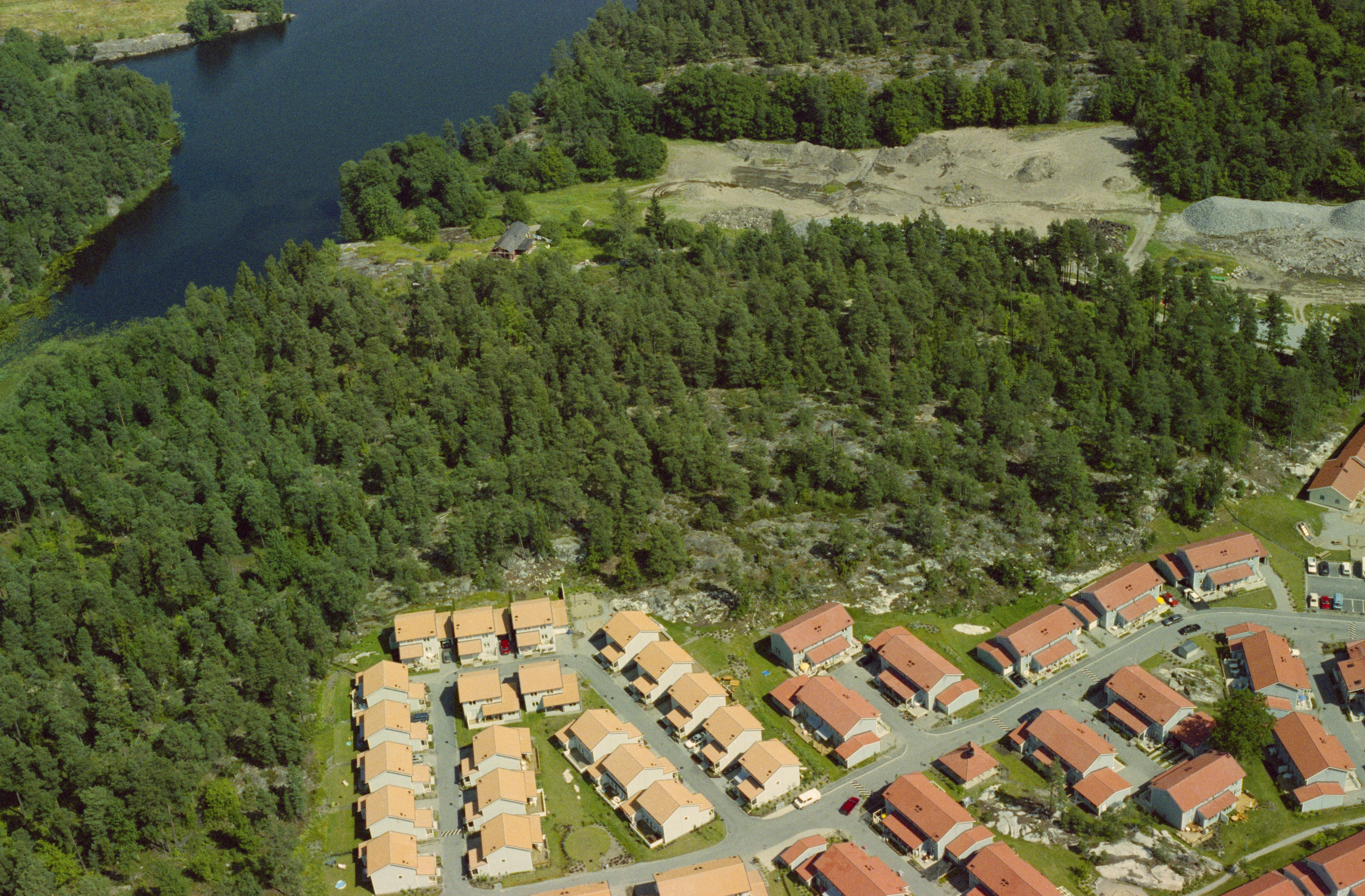 Beskrivning: Bostadsområdet Ösbydalen öster om Gustavsbergs tätort. Sjön Ösbyträsk uppe till vänster. Bilden är tagen mot (väderstreck): NO