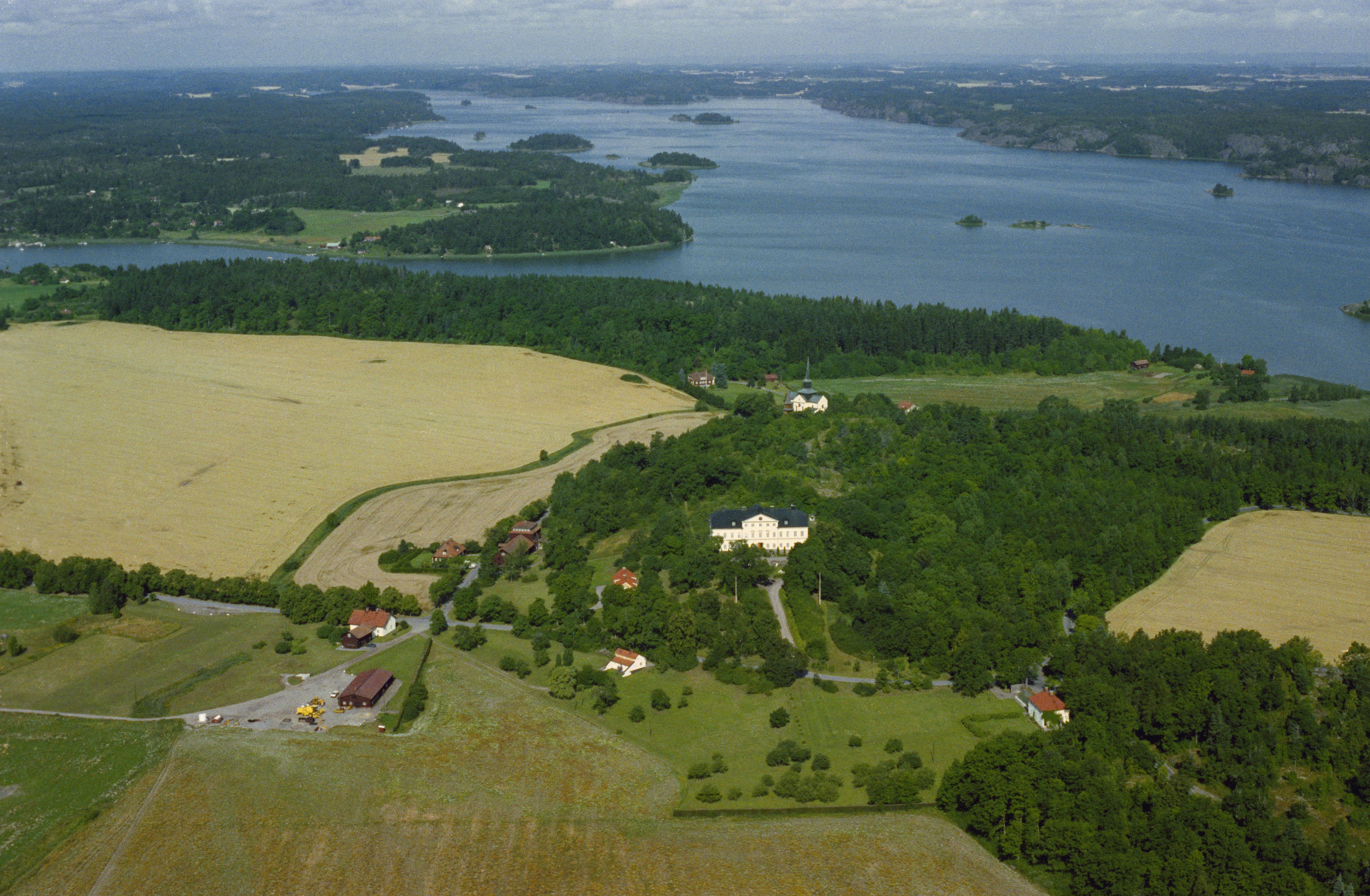 Beskrivning: Havsviken Slätbaken. Stegeborgs herrgård och Skällviks kyrka. Bilden är tagen mot (väderstreck): NV