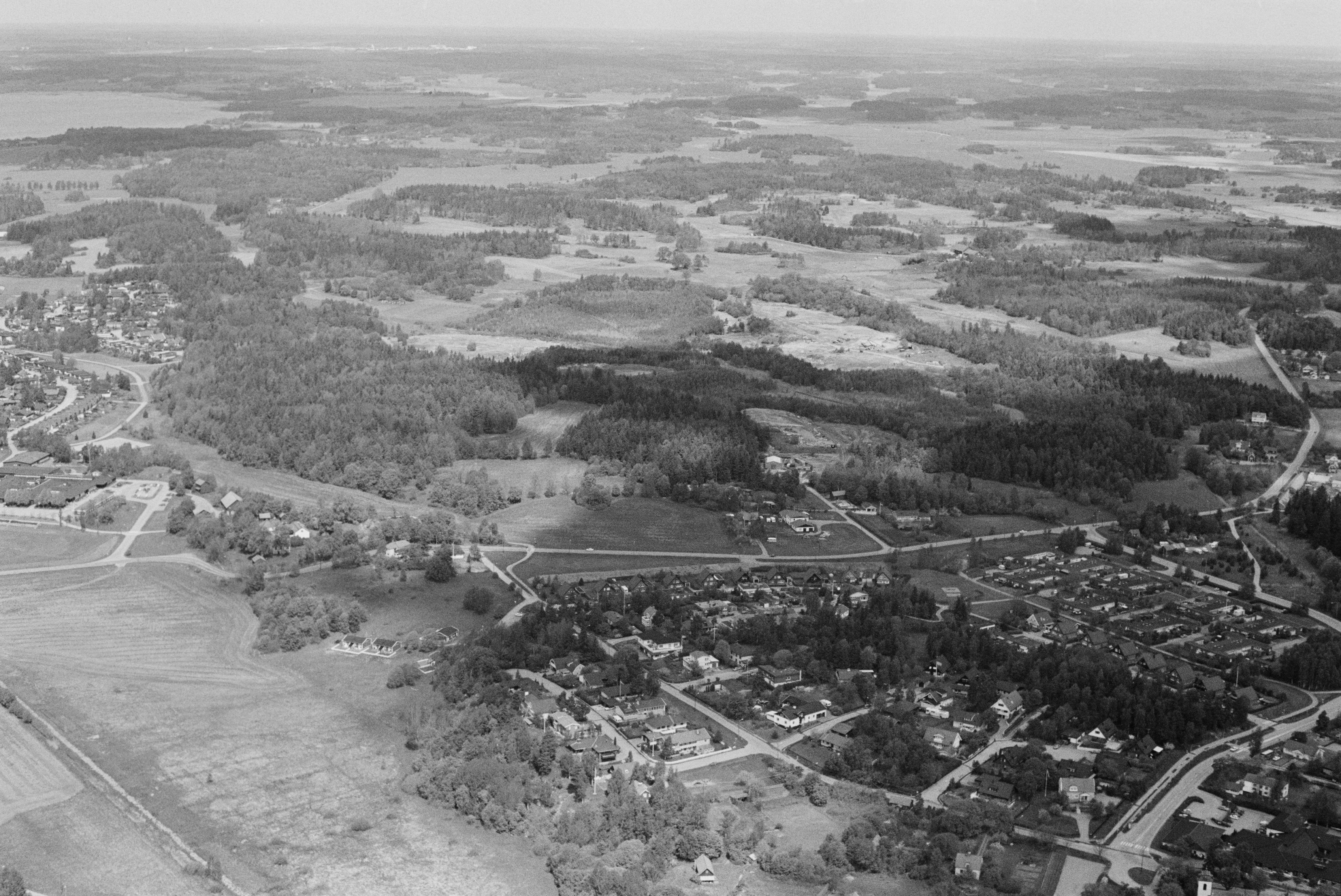 Beskrivning: Nere till höger skymtas Fresta kyrka. Vid bildens mitt grustäkt och Nibble golfbana i Hammarby socken. Bilden är tagen mot (väderstreck): N