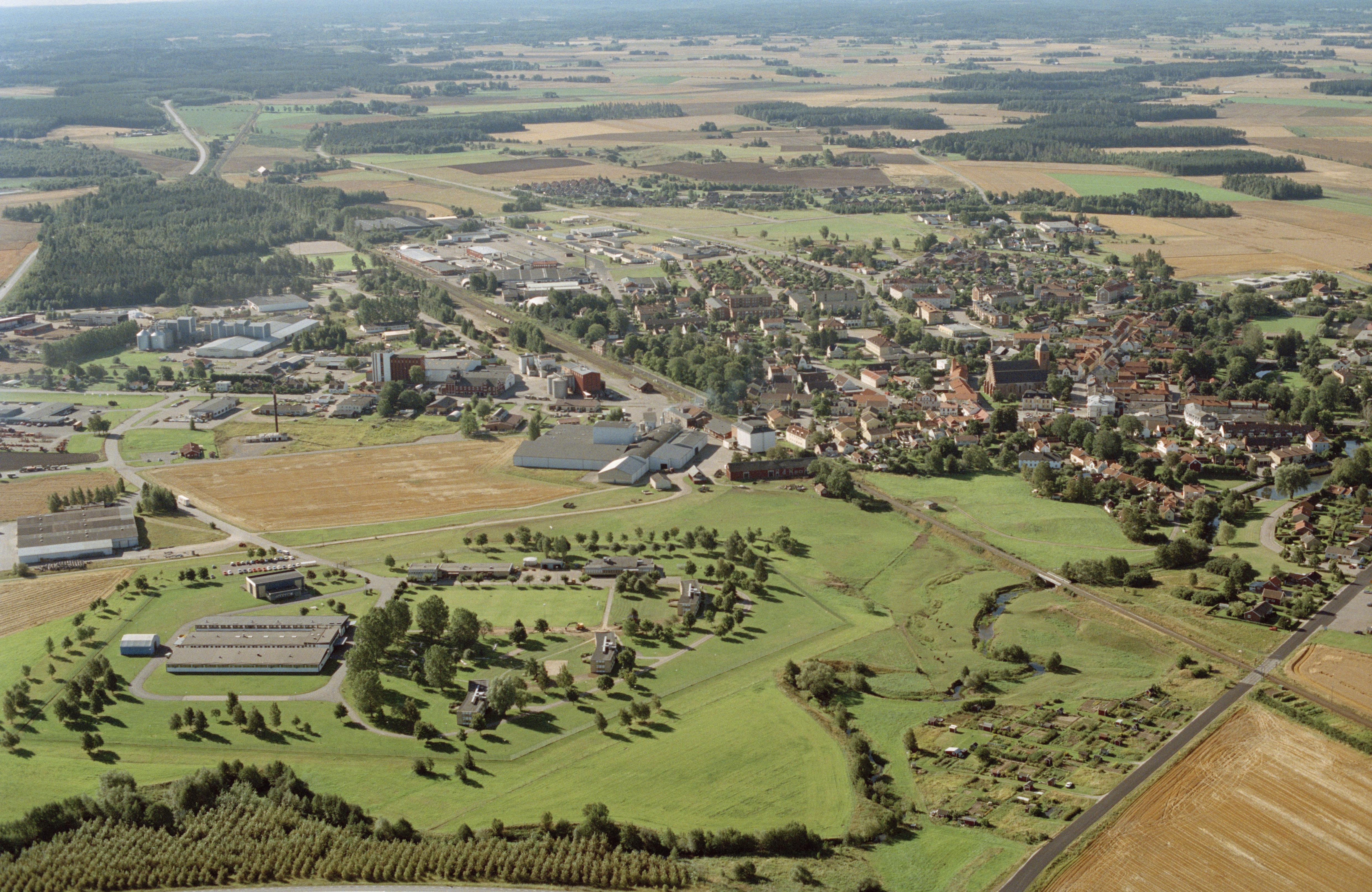 Beskrivning: Skenaån och fornlämningsområde vid Östanå med boplats RAÄnr Skänninge 33:1 m.fl. I bildens övre del Skänninge tätort. Vårfrukyrkan uppe till högert. Bilden är tagen mot (väderstreck): SSO