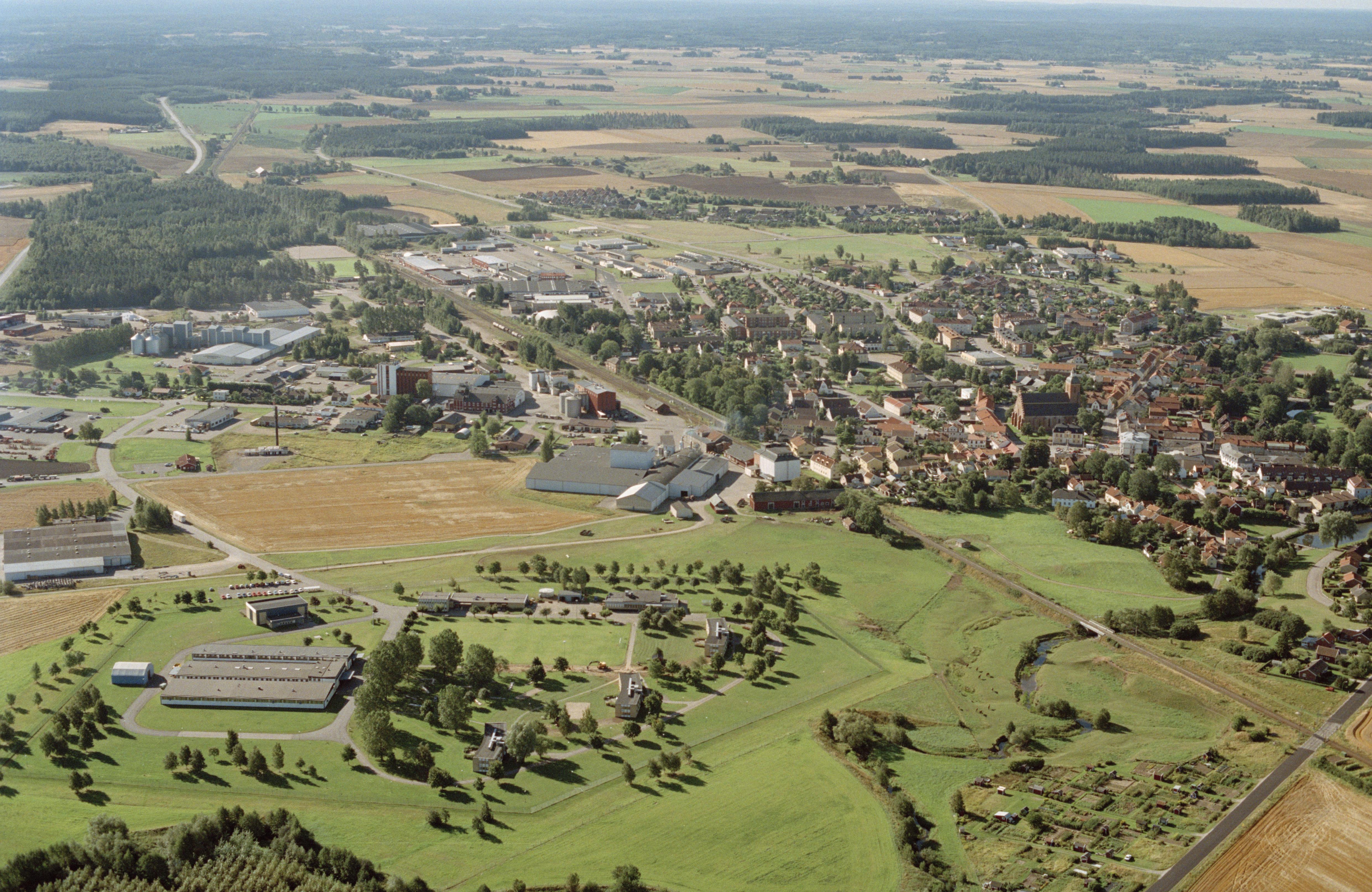 Beskrivning: Skenaån och fornlämningsområde vid Östanå med boplats RAÄnr Skänninge 33:1 m.fl. I bildens övre del Skänninge tätort. Vårfrukyrkan uppe till högert. Bilden är tagen mot (väderstreck): SSO