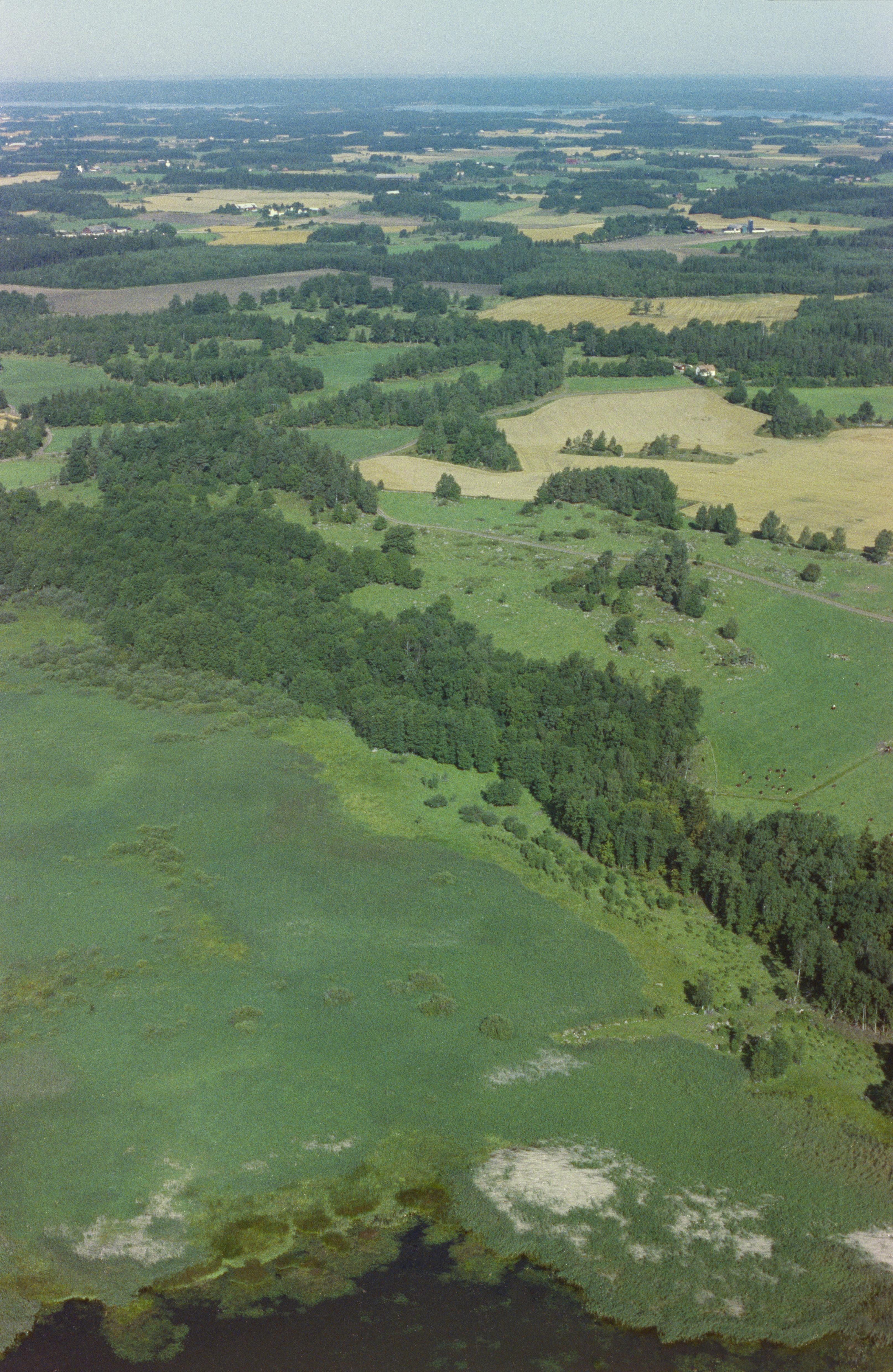 Beskrivning: Vid bildens mitt Halleby gamla tomt RAÄnr Skärkind 122:1 vid Hallebysjön. Över bildens mitt hägnadssystem RAÄnr Skärkind 285:1 m.fl. Bilden är tagen mot (väderstreck): V