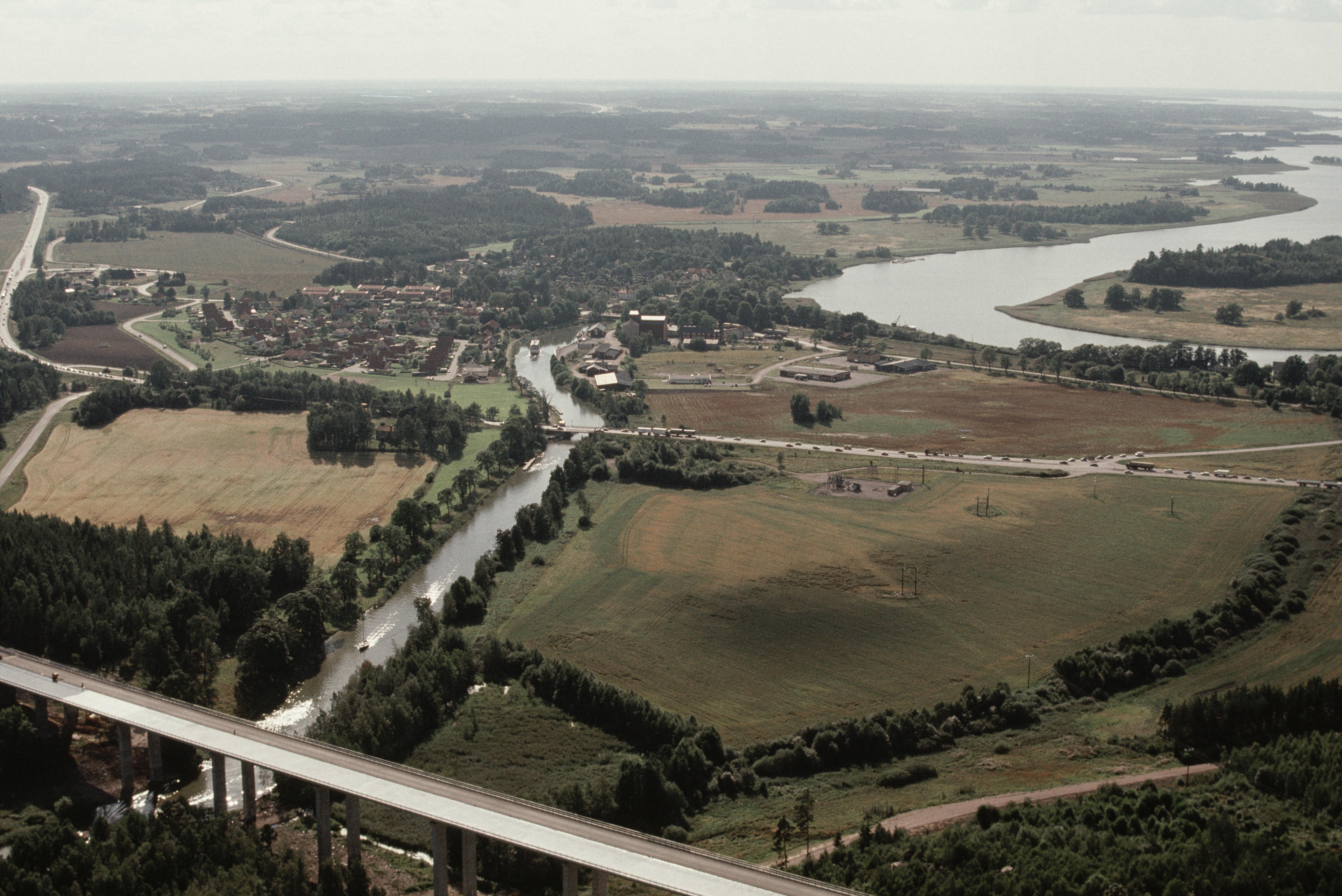 Beskrivning: Göta kanal vid tätorten Norsholm. Motala ström till höger i bildens övre del. Kanalmärke RAÄnr Kimstad 211:1 vid bildens mitt. Uppe till vänster Skärkinds socken. Bilden är tagen mot (väderstreck): VSV