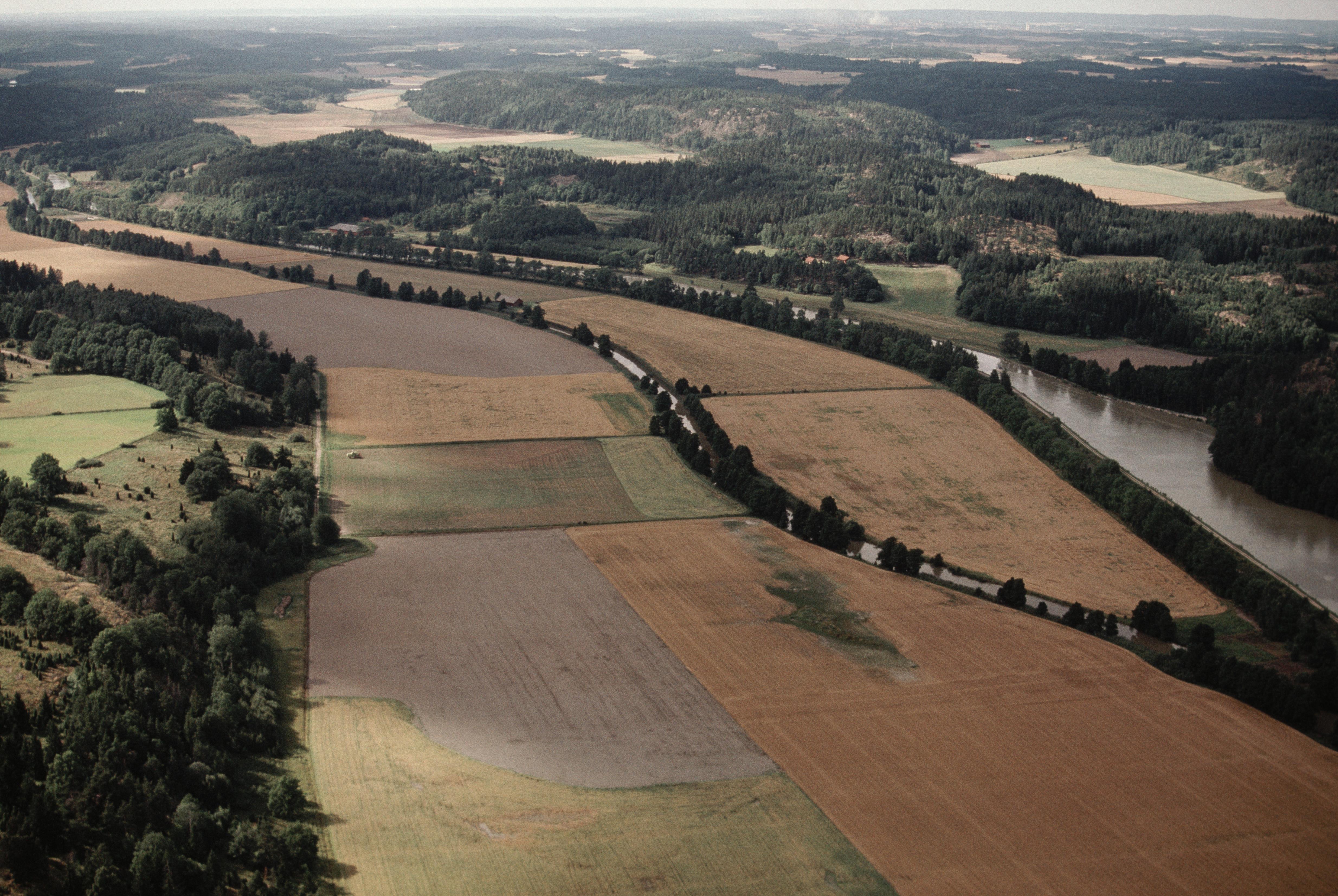Beskrivning: Norrväst om Liljestad. Storån till vänster och Göta kanal i Tåby socken till höger. Fyndplats (båtlämning) RAÄnr Skönberga 96:1 vid bildens mitt. Bilden är tagen mot (väderstreck): NV