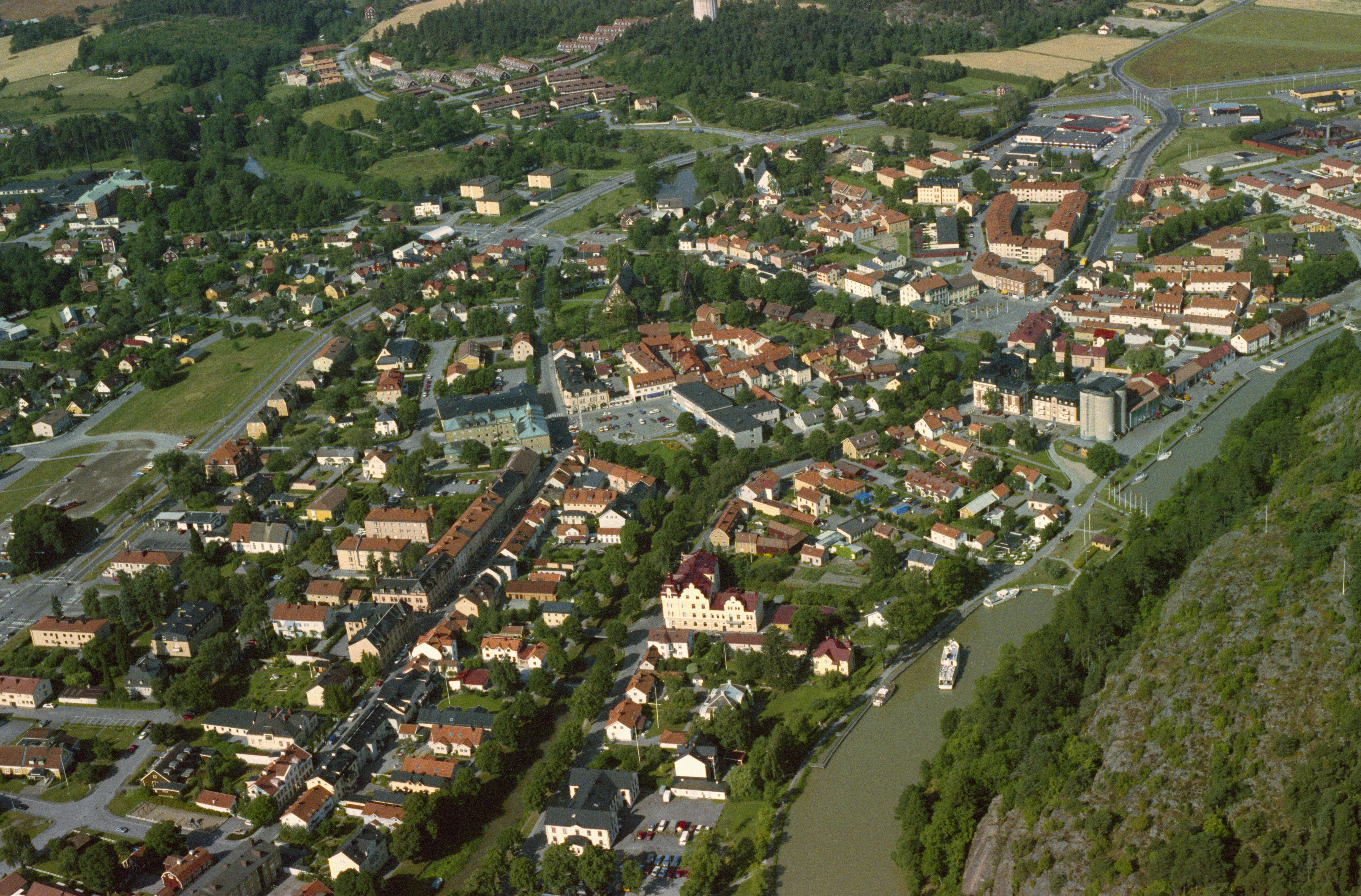 Beskrivning: Storån och Göta kanal (till höger) i Söderköpings stad. Stadslager RAÄnr Söderköping 14:1 till höger om bildens mitt. Ramunderberget i bildens högra kant. Bilden är tagen mot (väderstreck): VNV