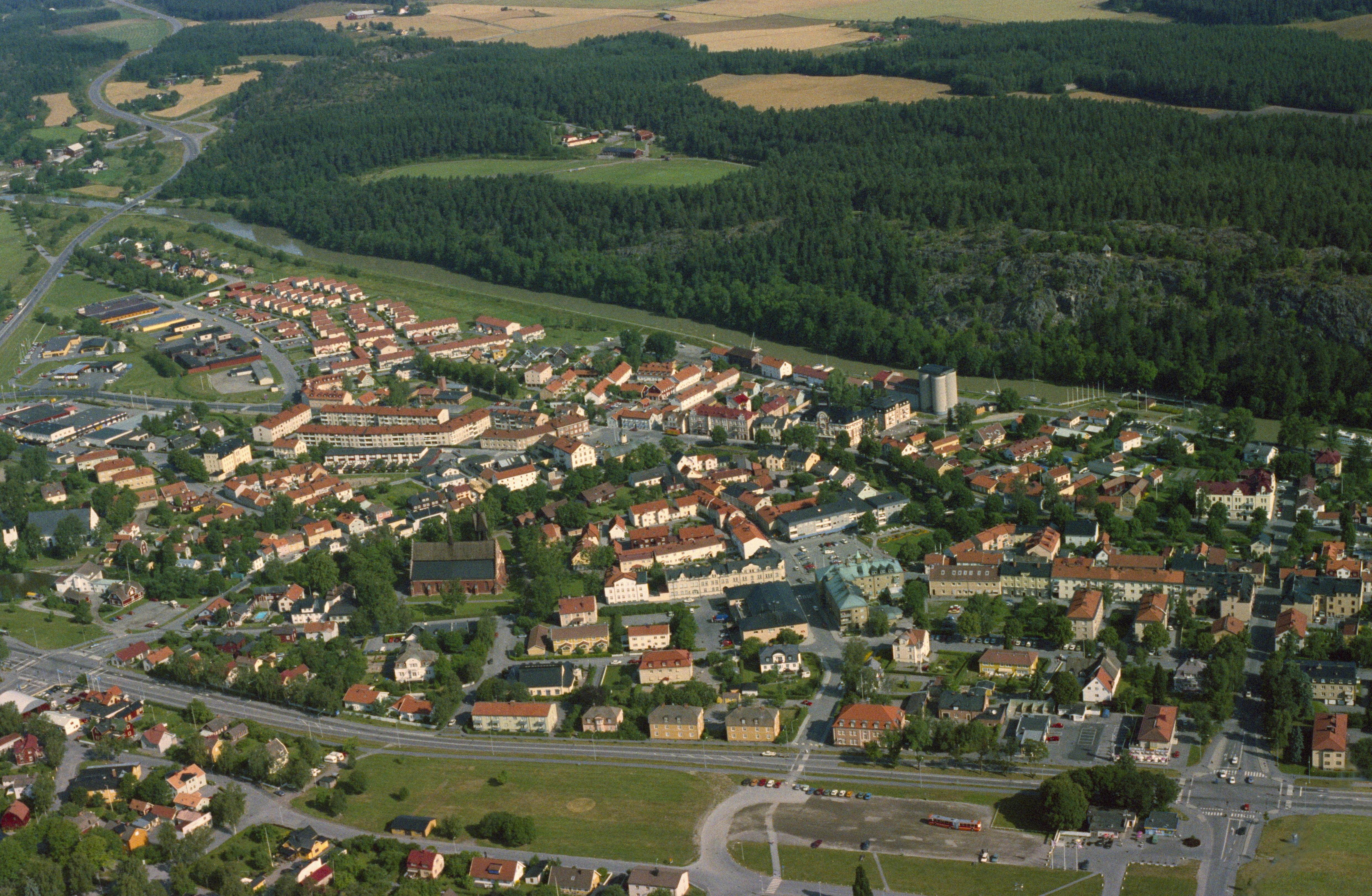Beskrivning: Storån och till höger Göta kanal vid Ramunderberget i Söderköpings stad. Drothems kyrka i bildens vänstra kant. Sankt Laurentii kyrka till vänster om bildens mitt. Bilden är tagen mot (väderstreck): N