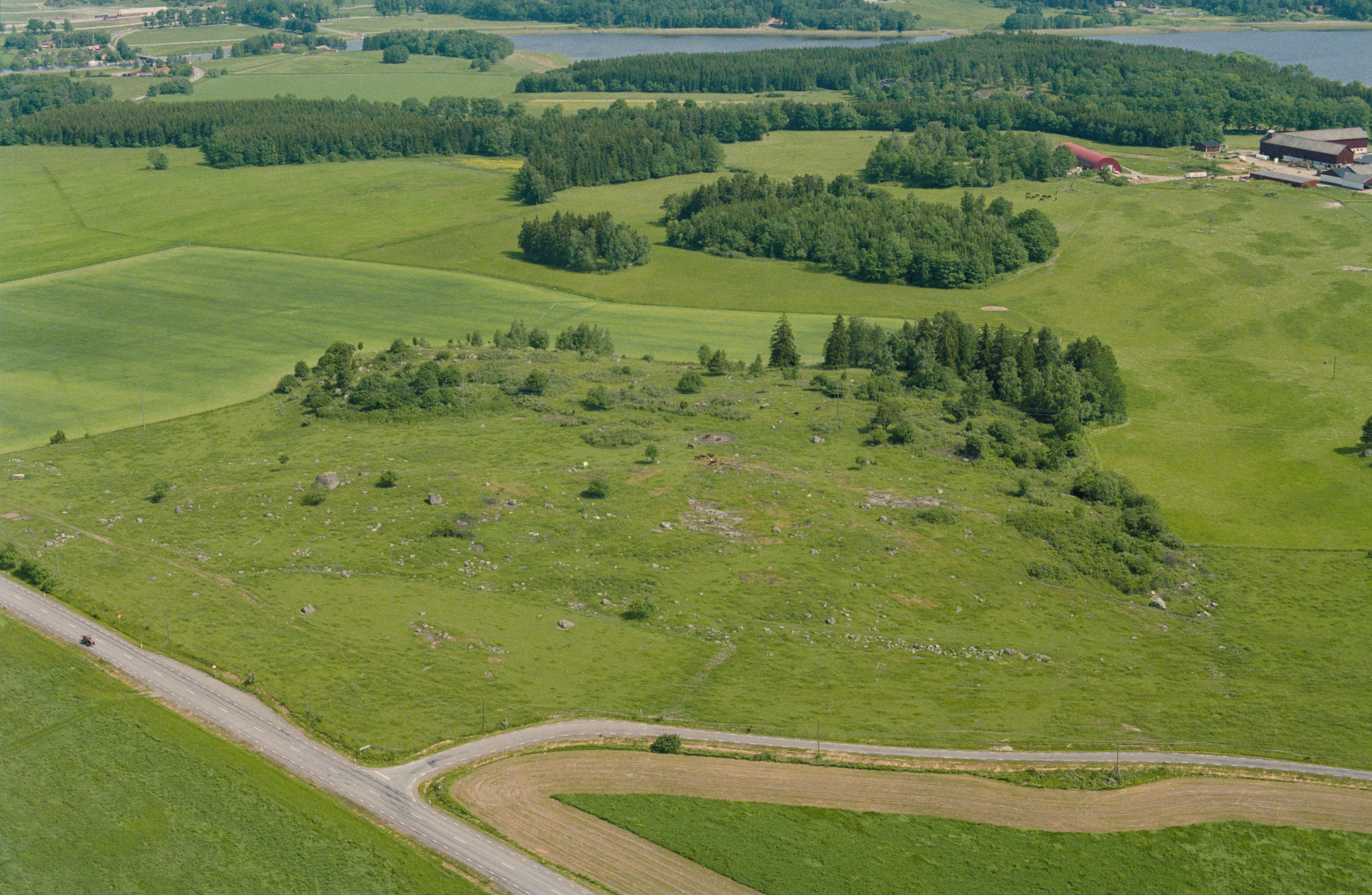 Beskrivning: Prästgårdsbacken i norra delen av Håtuna kyrkby. Bytomt RAÄnr Håtuna 169:1 och 170:1. I bildens övre del Håtunaviken i Mälaren mot socknet Sankt Per. Bilden är tagen mot (väderstreck): NNO