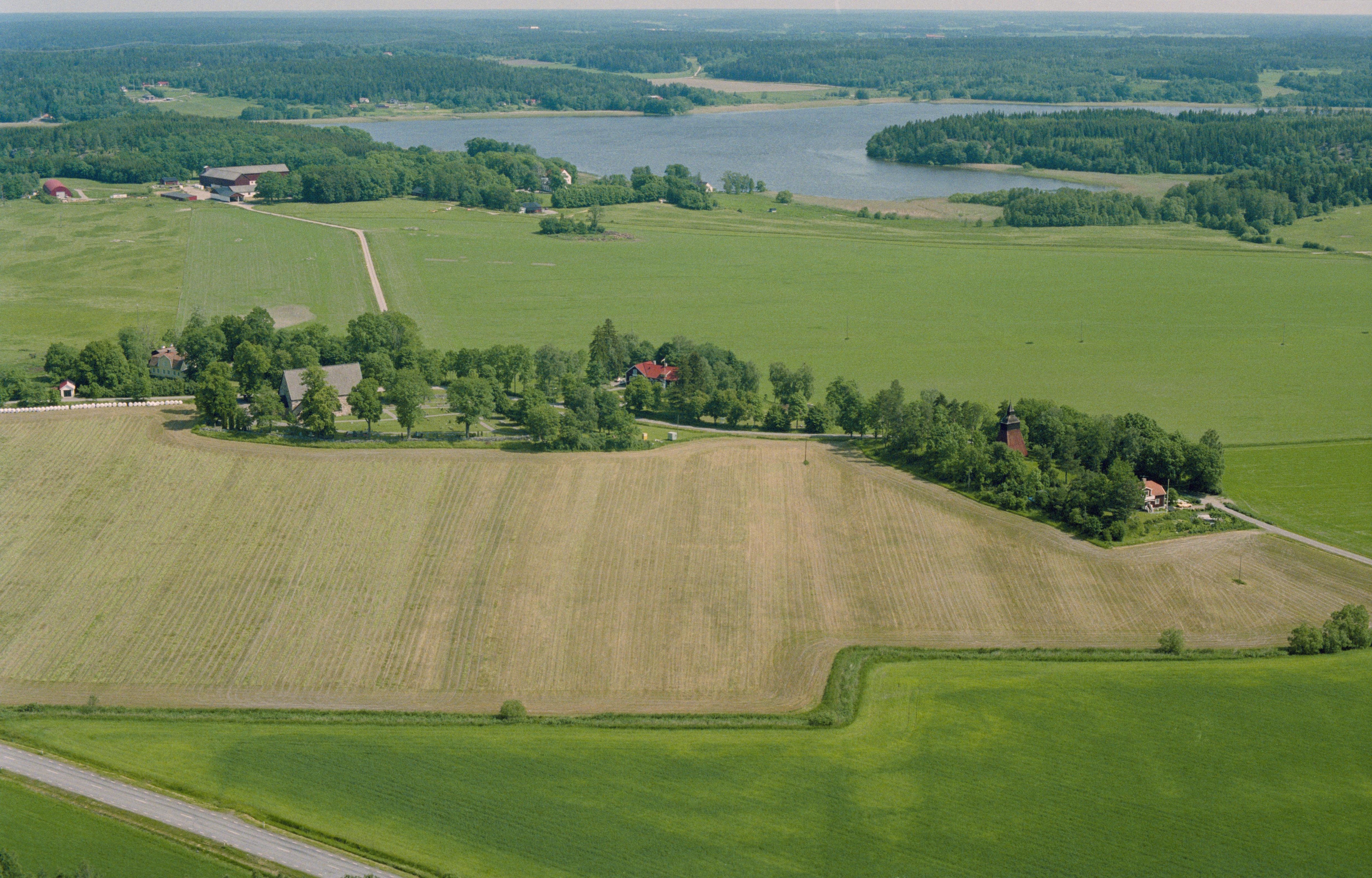 Beskrivning: Håtuna kyrka och kyrkby. Vid bildens mitt Prästgårdens gamla tomt RAÄnr Håtuna 157:1. I bildens övre del Håtunaviken i Mälaren mot socknet Sankt Per. Bilden är tagen mot (väderstreck): NO