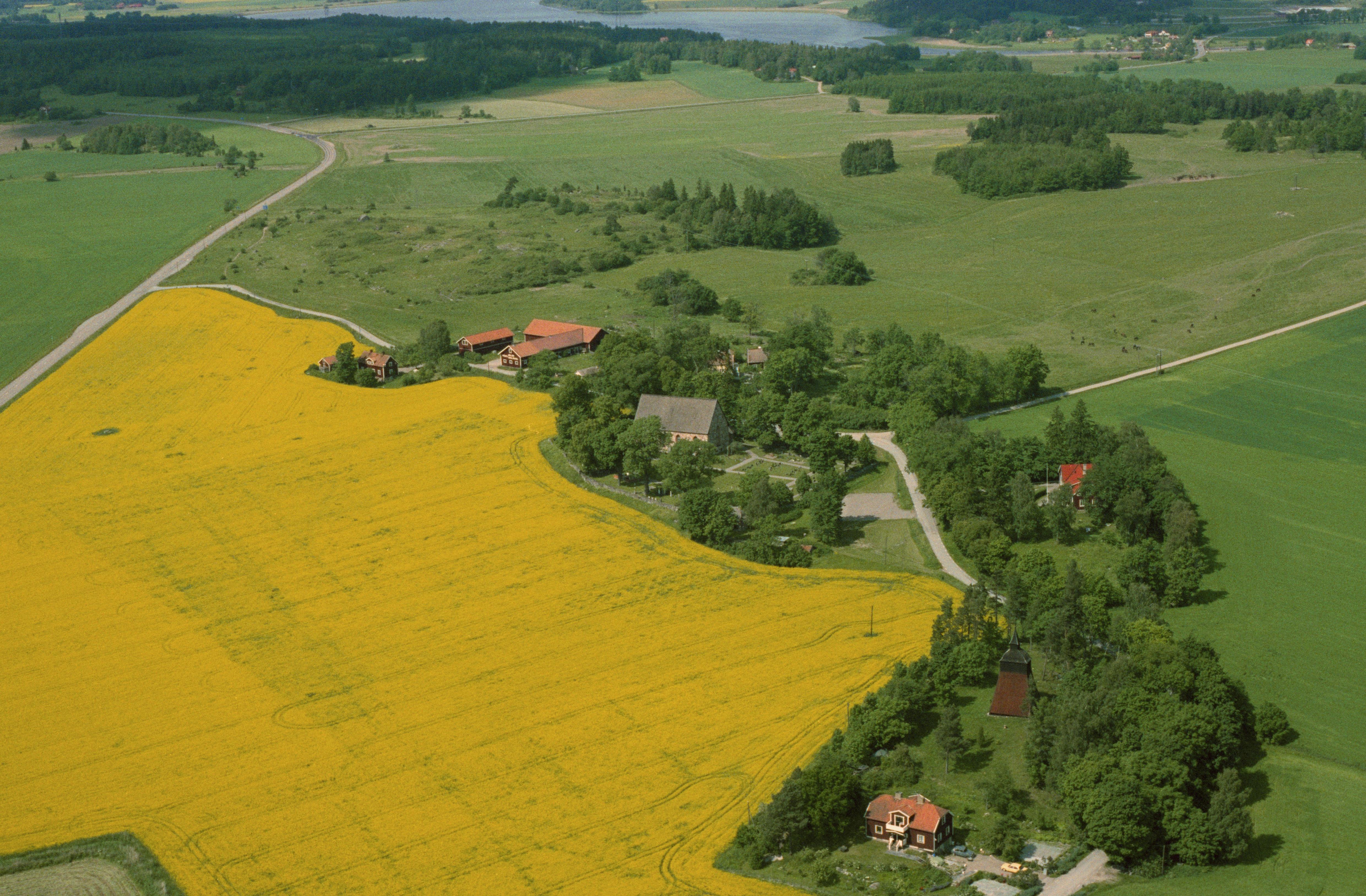 Beskrivning: Håtuna kyrka och kyrkby. Till höger om bildens mitt Prästgårdens gamla tomt RAÄnr Håtuna 157:1. I bildens övre kant Håtunaviken i Mälaren mot socknet Sankt Per. Bilden är tagen mot (väderstreck): NNV
