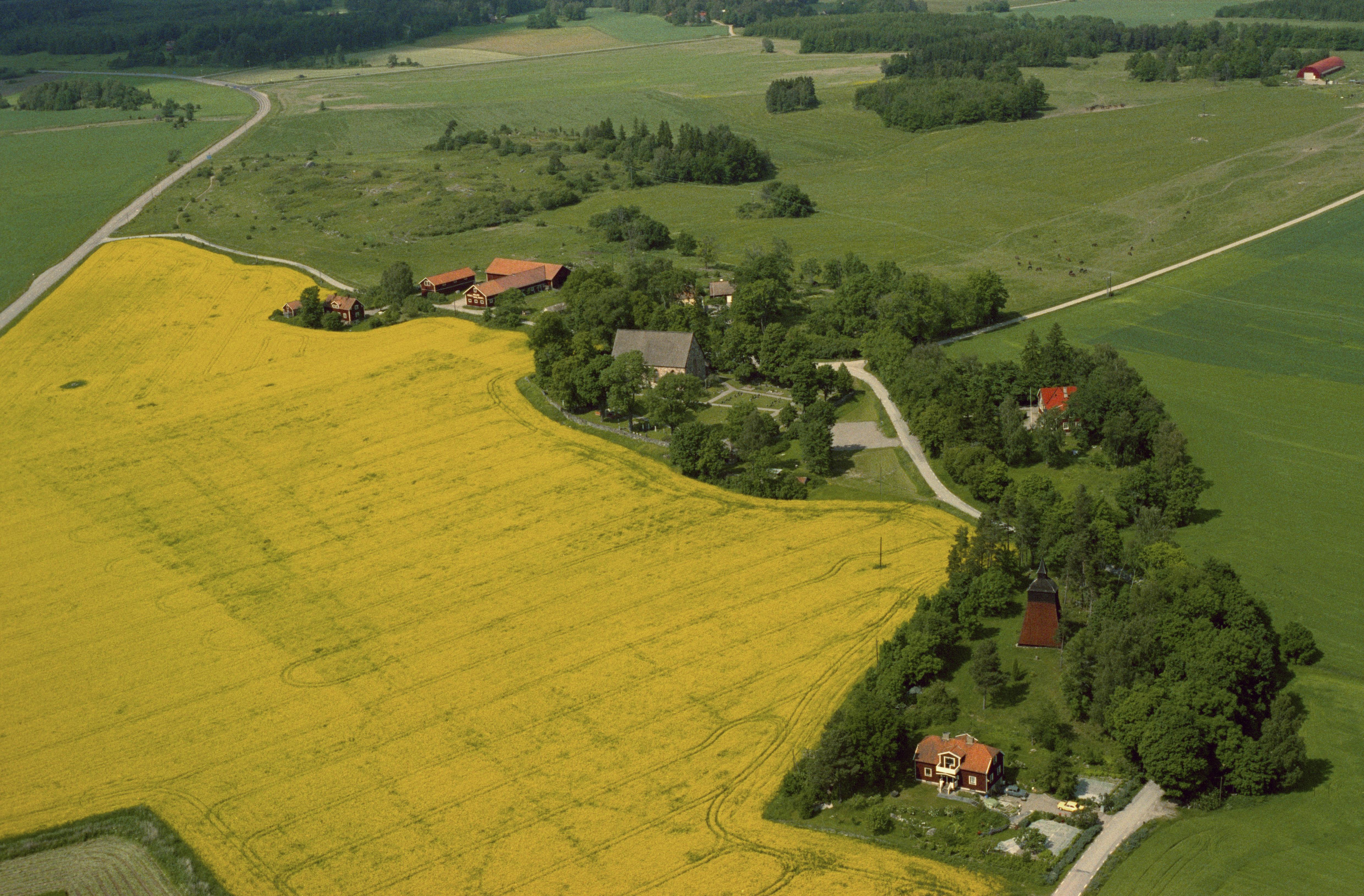 Beskrivning: Håtuna kyrka och kyrkby. Till höger om bildens mitt Prästgårdens gamla tomt RAÄnr Håtuna 157:1. Bilden är tagen mot (väderstreck): NNV